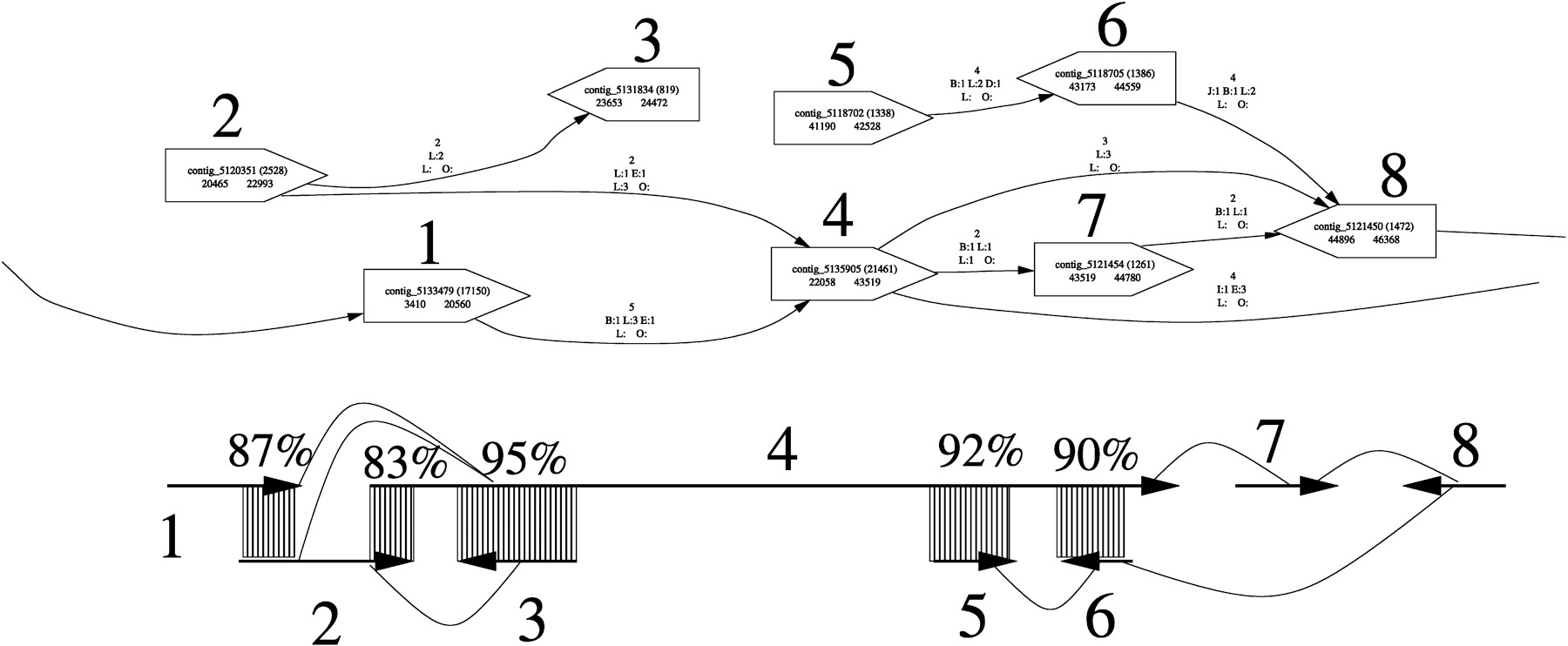 Haplotype structure in T. cruzi. The top image is Bambus output; the bottom is the haplotype structure as identified by alignments with MUMmer. For each alignment the percent identity is provided in the figure.