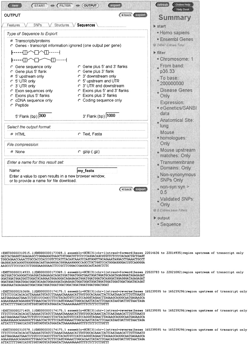 MartView output page showing the range of sequence retrieval options (human gene focus, sequences tab). An example of the corresponding FASTA output is also shown. The gene sequence options include gene sequence, gene withflanking sequence, upstream or downstream sequences of user-specified length, exons, transcripts, and coding sequence only. The user is guided by a graphical representation of sequence options.