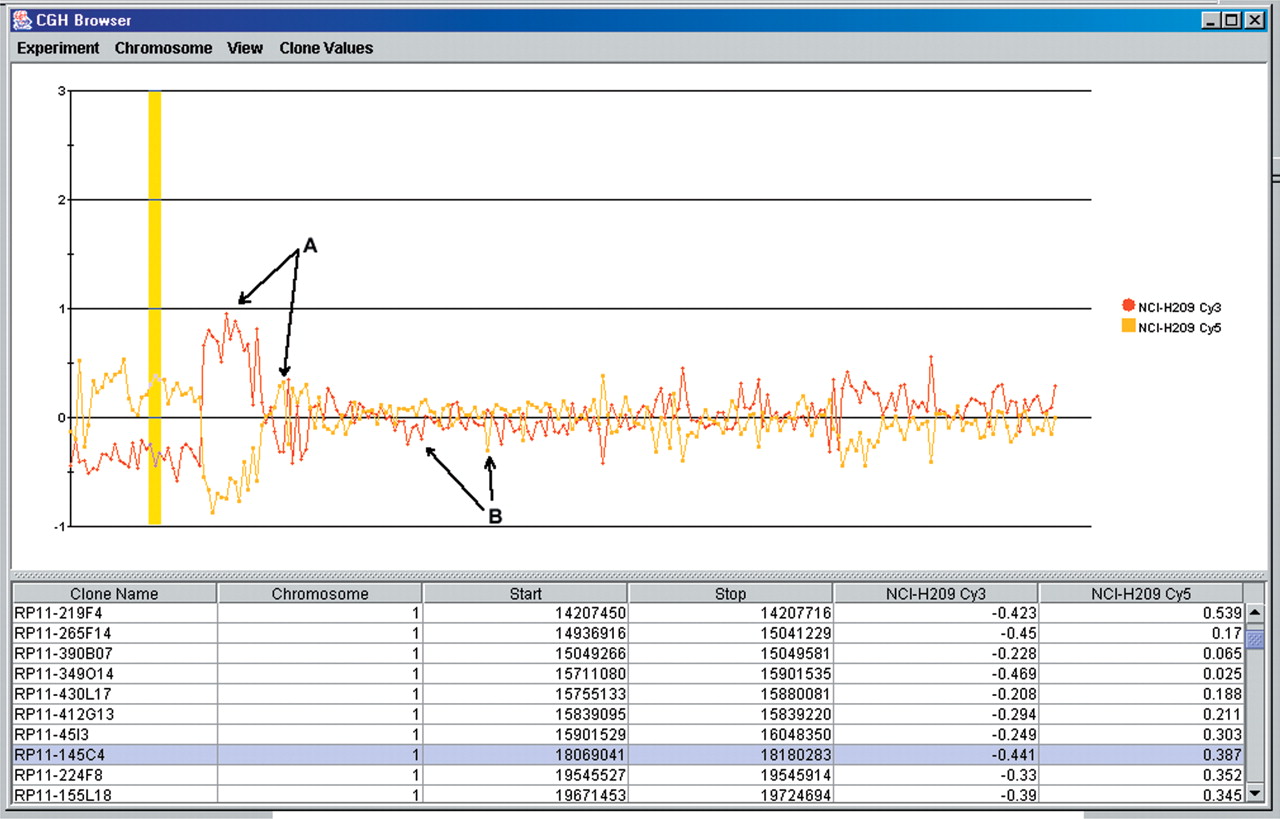 CGHBrowser screen shot depicting a chromosome 1p deletion flanked by a copy number increase in the lung cancer cell line NCI-H209. This view can be used to access raw data and estimate the amplitude of copy number changes. Scores from any spot-calling algorithm and Cy3/Cy5 ratios in a log2 and linear scale can also be visualized. The abscissa can be set to display data scaled to genome coordinates or in linear order (shown here). Intensity ratios with tumor DNA labeled with Cy3-dCTP are red; the same DNA labeled with Cy5-dCTP is represented in yellow. Ratios above or below the threshold for normal variation that represent true copy number gain or loss should have a dye-swap match of equal magnitude above or below y = 1 or y = -1, respectively (arrow A). Clones not conforming to this pattern consistently in normal:normal cohybridizations were eliminated from the set (arrow B).