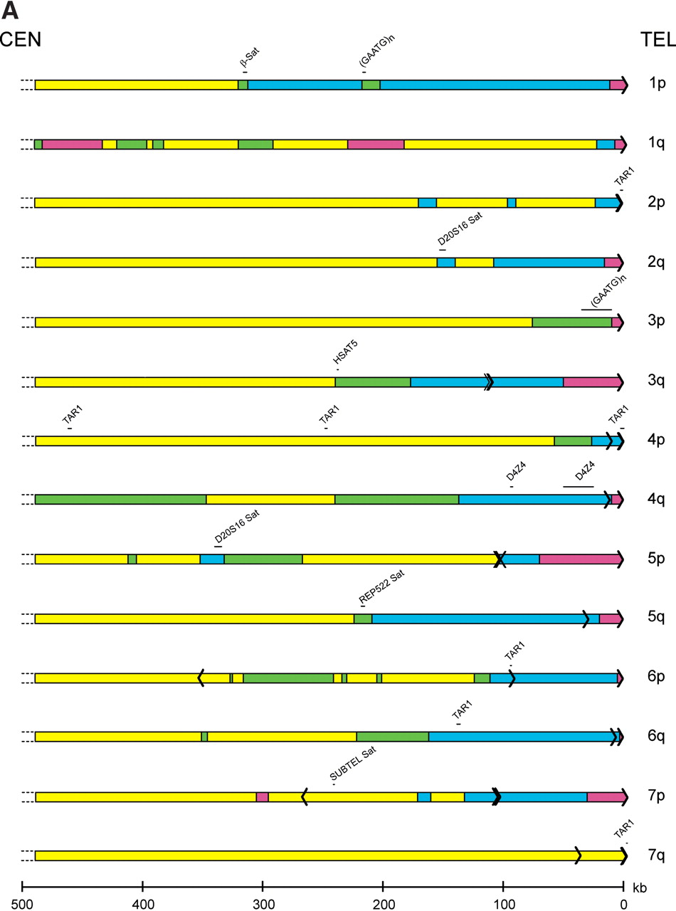 Sequence organization of subtelomeric assemblies. The terminal fragment of each chromosome arm that contains a subtelomeric sequence assembly is depicted. (Yellow) Single-copy DNA; (green) segmentally duplicated DNA unique to a single subtelomere region; (blue) segmentally duplicated subtelomeric repeat DNA; (magenta) unsequenced subtelomeric DNA. Each black arrow within the rectangles depicts a single (TTAGGG)n-like sequence, with the arrow pointing in the 5′ to 3′ direction for the G-rich strand. The position of satellite sequences detected by RepeatMasker software is indicated above each telomere diagram. The positions of the shortest reference alleles for the 8p, 9q, 11p, and 16p telomeres are indicated by a black line segment terminating with an arrow beneath the sequence assemblies for these telomeres.