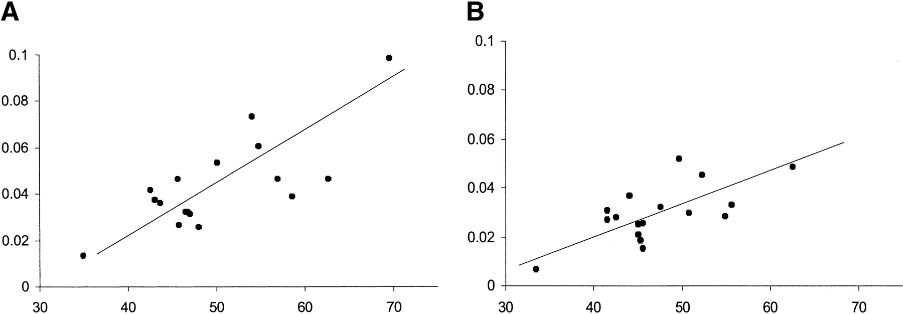 Relationship between the rate of nucleotide substitution (estimated by the Tamura-Nei method, Y-axis) and the GC content (%, X-axis) of intron sequences. (A) The entire sequence of each segment was used. Pearson's correlation coefficient is 0.76 (p < 0.01). (B) CpG dinucleotides were excluded. Pearson's correlation coefficient is 0.67 (p < 0.01).