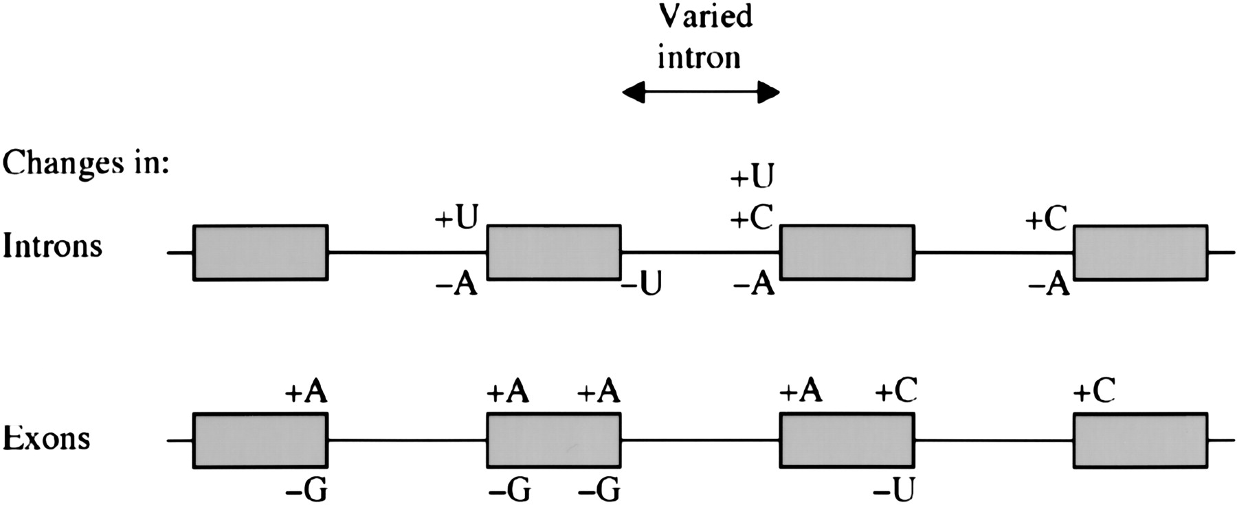 General nucleotide content changes near splice sites in the neighborhood of a varied intron. Differences in the general nucleotide content in the neighborhood of introns >2047 compared with introns 60-127 (Table 1). Increasing intron length correlates with A enrichment of exon sequences flanking the varied intron, and the preceding intron, whereas C enrichment occurs for the following intron. Increasing intron length also correlates with U and C enrichment upstream of the acceptor of the varied intron (pyrimidine tract), whereas U enrichment occurs upstream of the preceding acceptor and C enrichment occurs for the following acceptor. Only significant nucleotide content changes in the various regions are illustrated based on a two-tailed t-test with p > 0.99.