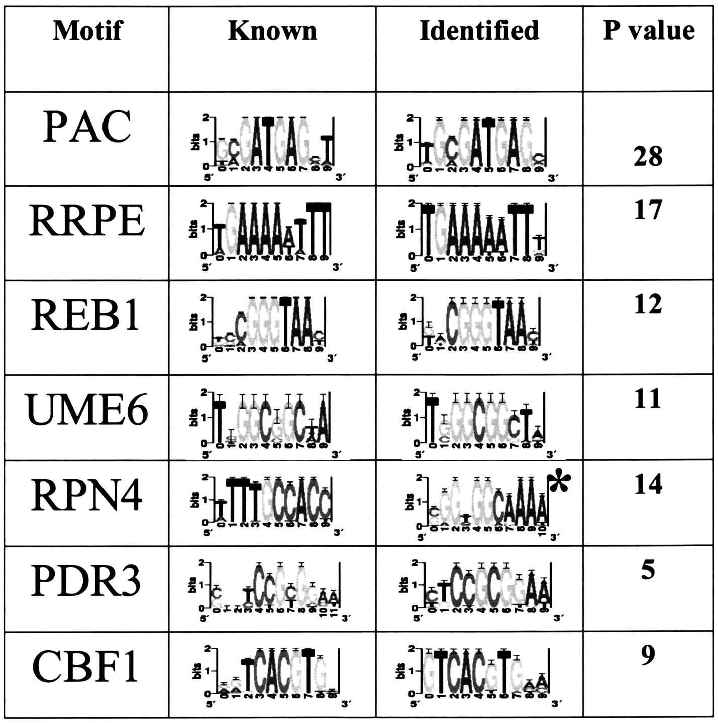 Columns: (1) binding site (motif) name, (2) sequence-logo representation of known binding site, (3) sequence-logo representation of the best phylogenetically mapped motif (* reverse complement), (4) P-value for network-level conservation (Log10(p)) of the best matching phylogenetically mapped motif.