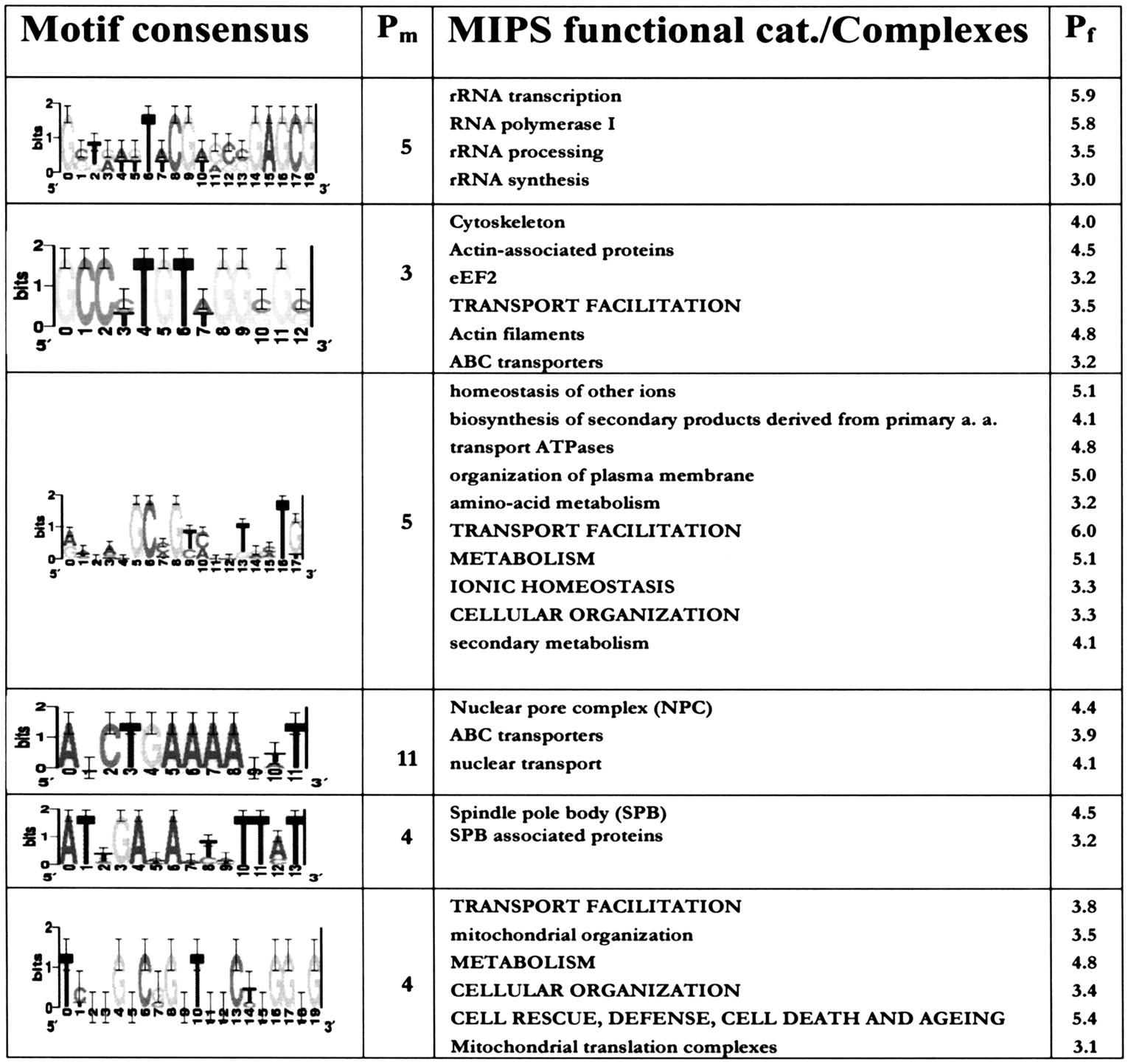 Columns: (1) sequence-logo representation of motif, (2) Network-level conservation P-value (Log10)), (3) MIPS function and complexes categories which are significantly enriched, (4) P-value for functional enrichment, determined from the hypergeometric distribution (Log10(p); not corrected for multiple testing).
