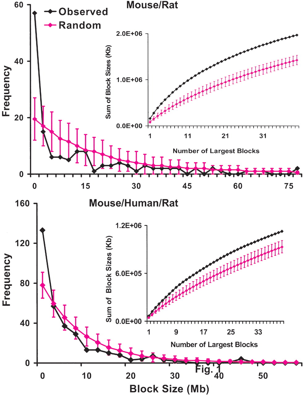 Syntenic block length distribution. The numbers of blocks with length above 100 kb in 2.5-Mb bins are plotted in blue. Expected values at 95% confidence for each bin on the basis of the Monte Carlo simulation of the random breakage model are plotted in pink. The data indicate that there are significantly more small blocks than what are predicated by the random breakage model, further confirmed by examining the distributions of the sum of sizes of the largest 40 blocks (as shown in the insets, the predicated values are smaller). (Top) The synteny between mouse and rat. (Bottom) The synteny among mouse, rat, and human. (Insets) Distributions of the sum of the lengths (kb) of the largest 40 blocks for the observed data (blue) and the predicated values at 95% confidence based on the random model (pink).