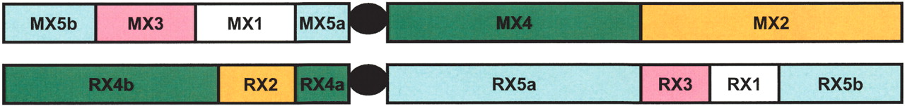 An apparent differential use of the two arms of HX in mouse and rat. Through several breakages and inversions, HX can be transformed to five fragments of MX as well as five fragments of RX (numerically numbered in blocks as MX1, MX2, or RX1, RX2...). Specifically, HXp corresponds to three fragments of MX (the last 20 Mb, a middle 17 Mb, and the start 16 Mb), and to two middle fragments of RX. HXq corresponds to three fragments of RX (the last 78 Mb, a middle 9 Mb, and the start 12 Mb), and to two middle fragments of MX. Blocks with the same fragment number in both mouse and rat are indicated with the same color (e.g., MX1 and RX1 are both represented as white blocks). Block sizes are somewhat arbitrary and do not reflect the actual fragment length. MX1: 3-19 Mb, MX2: 19.3-61, MX3: 80-63, MX4: 80-130, MX5a: 133-130, and MX5b: 150-135. RX1: 12-0.8, RX2: 29-12, RX3: 38-29, RX4a: 42-40, RX4b: 44-82, RX5a: 82-129, and RX5b: 132-160 (fragment ranges are all in Mb).