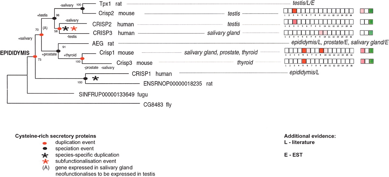 Phylogenetic relationships and expression profiles in the cysteine-rich secretory protein (CRISP) family. The phylogenetic tree was constructed by the minimum evolution method after CLUSTALW sequence alignment of protein sequences. Bootstrap values are shown. Human CRISP1, CRISP2, CRISP3, and mouse Crisp1, Crisp2, Crisp3, were compared with three rat genes: testis-specific protein 1, Tpx1 (Maeda et al. 1998; O'Bryan et al. 1998); epididymal glycoprotein, AEG (Charest et al. 1988); and an Ensembl novel gene prediction, as well as outgroups from Fugu rubripes and Drosophila melanogaster (used to root the tree). Where GEA data were not available (CRISP1 and all rat genes), expression evidence from the literature (L) or EST databases (E) was used. The numbering and color scheme for gene expression data is the same as in Figure 3.