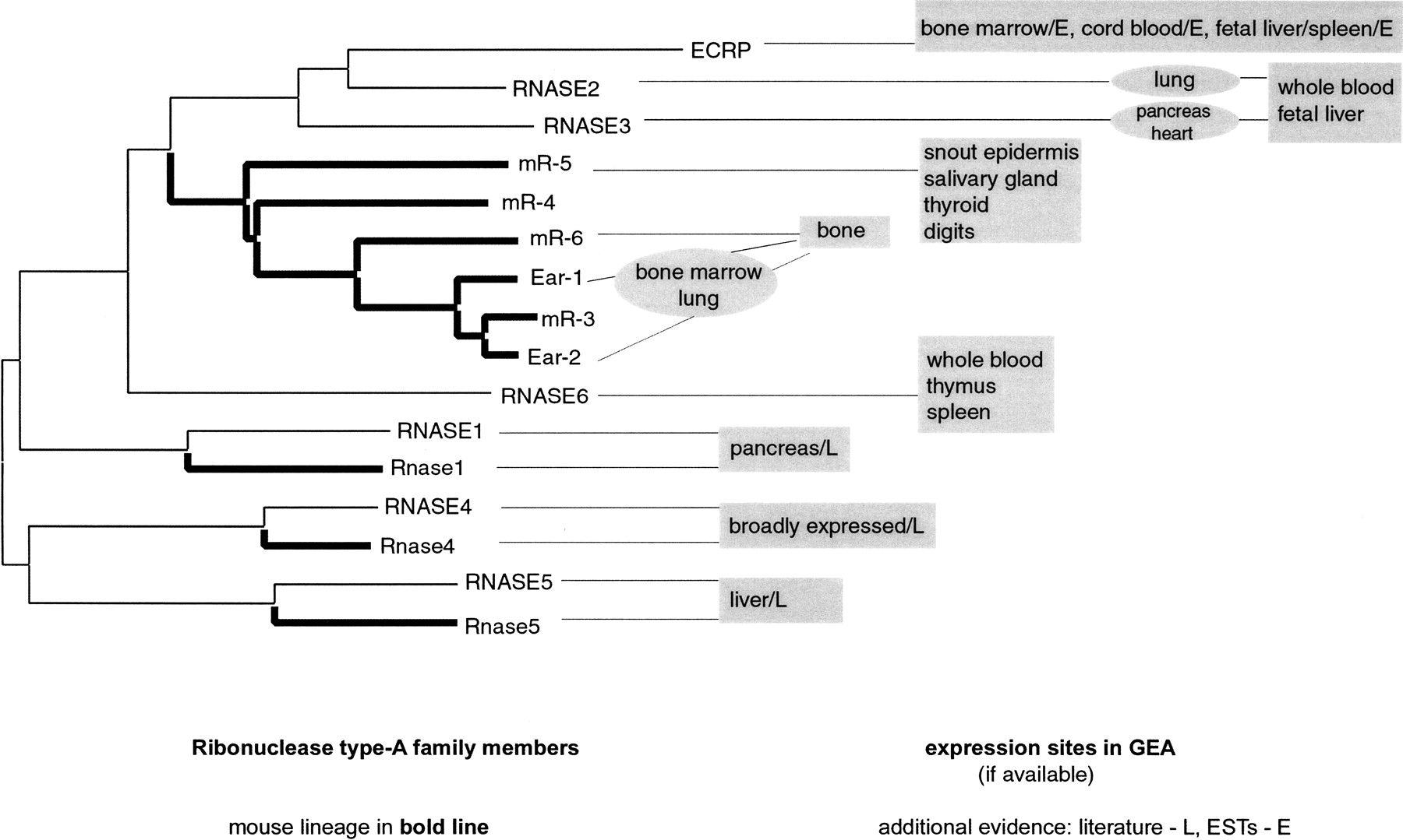 Type-A ribonucleases. Amino acid p-distance neighbor-joining tree with sites of expression in GEA for the eosinophil-associated subfamily. Seven human genes and nine mouse genes were compared. Mouse lineages are drawn as bold lines. Amino acid sequences were aligned using CLUSTALW, and the tree was drawn using Mega v. 2.1.