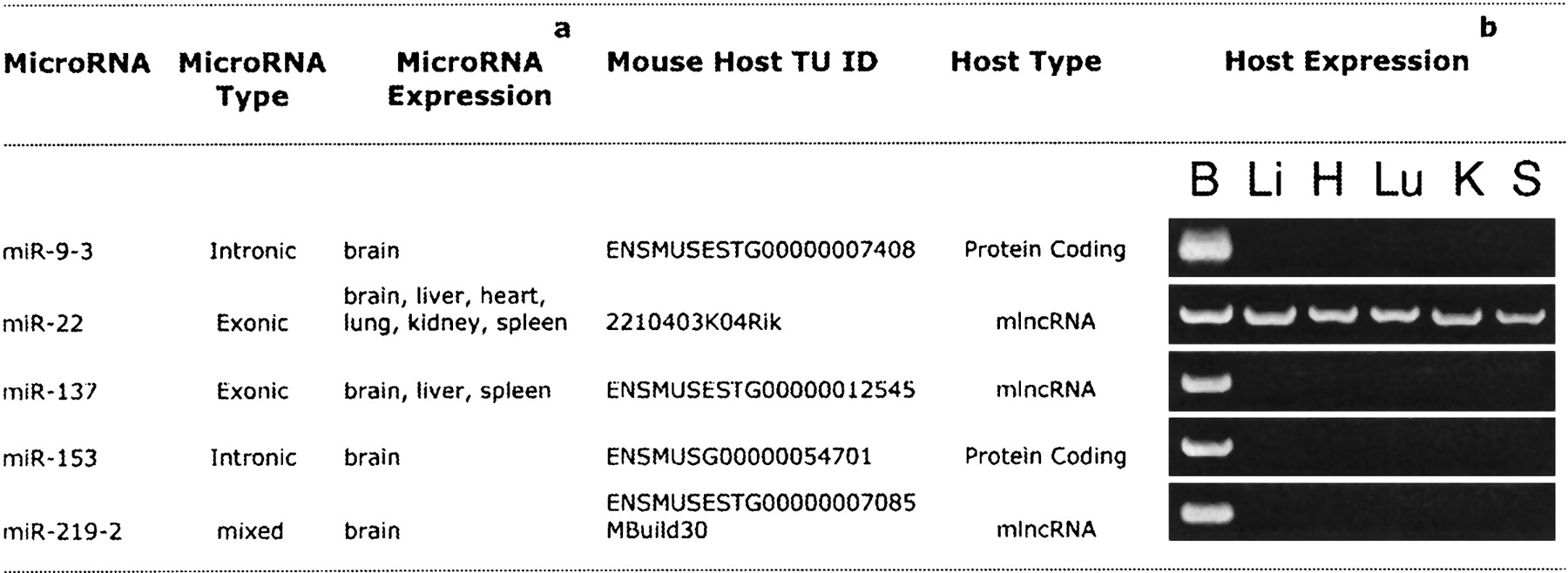 b An ethidium bromide-stained gel picture shows RT-PCR results from mouse adult brain (B), liver (Li), heart (H), lung (Lu), kidney (K), and spleen (S).