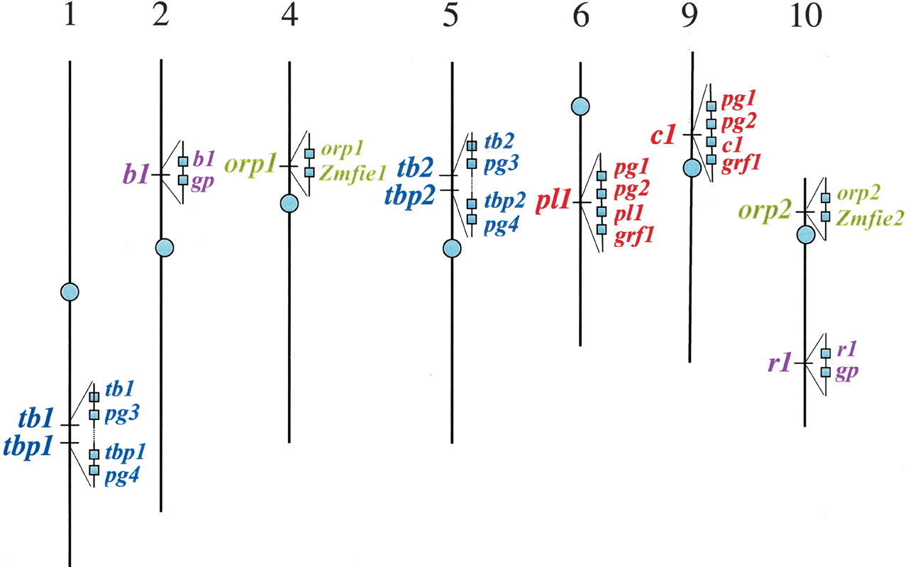 Chromosomal location and physical arrangement of 11 genes' orthologs. Five duplication regions are shown in their related mapping position in the seven maize chromosomes, with tb1/2 and tbp2 closely linked. Genes (boxes) are arranged according to their gene order on an assembled BAC sequence contig (solid line within each triangle). The dashed line symbolizes about 7 cM of genetic distance between the tb1/2 and tbp1/2. For each of the BAC contigs, their actual orientations in the chromosomes are not known. The Zmfie1 and Zmfie2 are not a strict orthologous pair (see explanation in text), thus, are not included in our sequence analysis.
