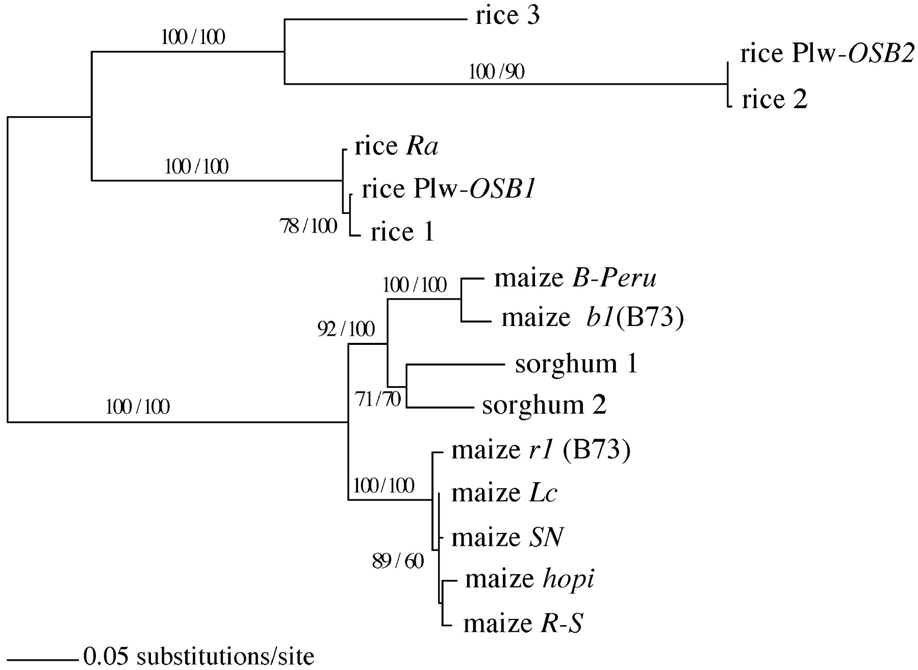 Phylogenetic relationships among r1/b1 gene homologs resulting from ML (GTR+I+G) analysis. The numbers at the internodes represent bootstrap proportions from MP/ML analyses.
