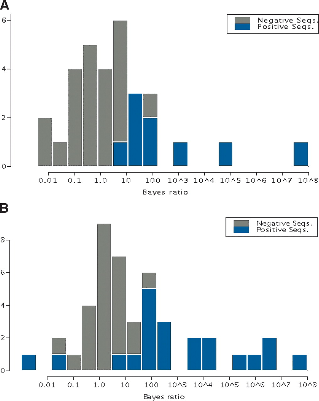 (A) Histogram of the Bayes ratio, on a log10 scale, for the positive and negative validation sequence pairs in which a module was predicted. There are nine positive sequences with a predicted module, and 22 negative sequence pairs. (B) The distribution of Bayes ratios, on a log10 scale, for positive and negative training sequences from cross-validation which contained a predicted module. A rebuild of the models was required for only the 24 negative pairs with predicted modules from the original negative training set, as the other sequences contributed nothing to the model.