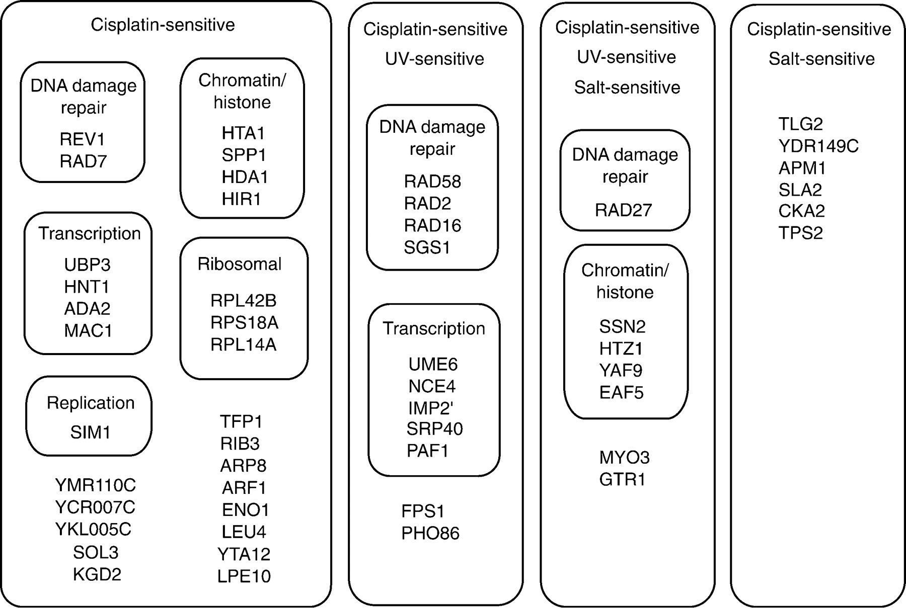 Diagrammatic summary of phenotypic screening for cisplatin sensitivity. Fifty-one genes conferring sensitivity to cisplatin upon disruption are indicated in functional groups related to DNA damage/repair, transcription, replication, chromatin structure, and ribosomal function. Ungrouped genes function in processes that were not enriched among this set. Standard gene names have been used when available. YCR007C, YDR149C, YKL005C, and YMR110C are functionally uncharacterized.
