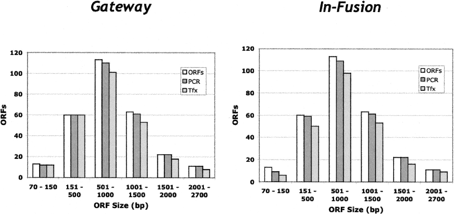 Pilot study: comparison of Gateway BP and In-Fusion cloning methods. Plasmid DNA from 288 MGC clones was PCR-amplified using Platinum Pfx Polymerase (Invitrogen) with end sequences suitable for use in either the Gateway BP or In-Fusion cloning systems. The PCR products were then used in in vitro recombination reactions with the plasmids pDONR 201 (Gateway) or linearized pDNR-Dual (In-Fusion). The products of the recombination reactions were then used to transform E. coli. (White bars) Total MGC ORFs; (dark-gray bars) successful PCR reactions; (light-gray bars) successful transformations.