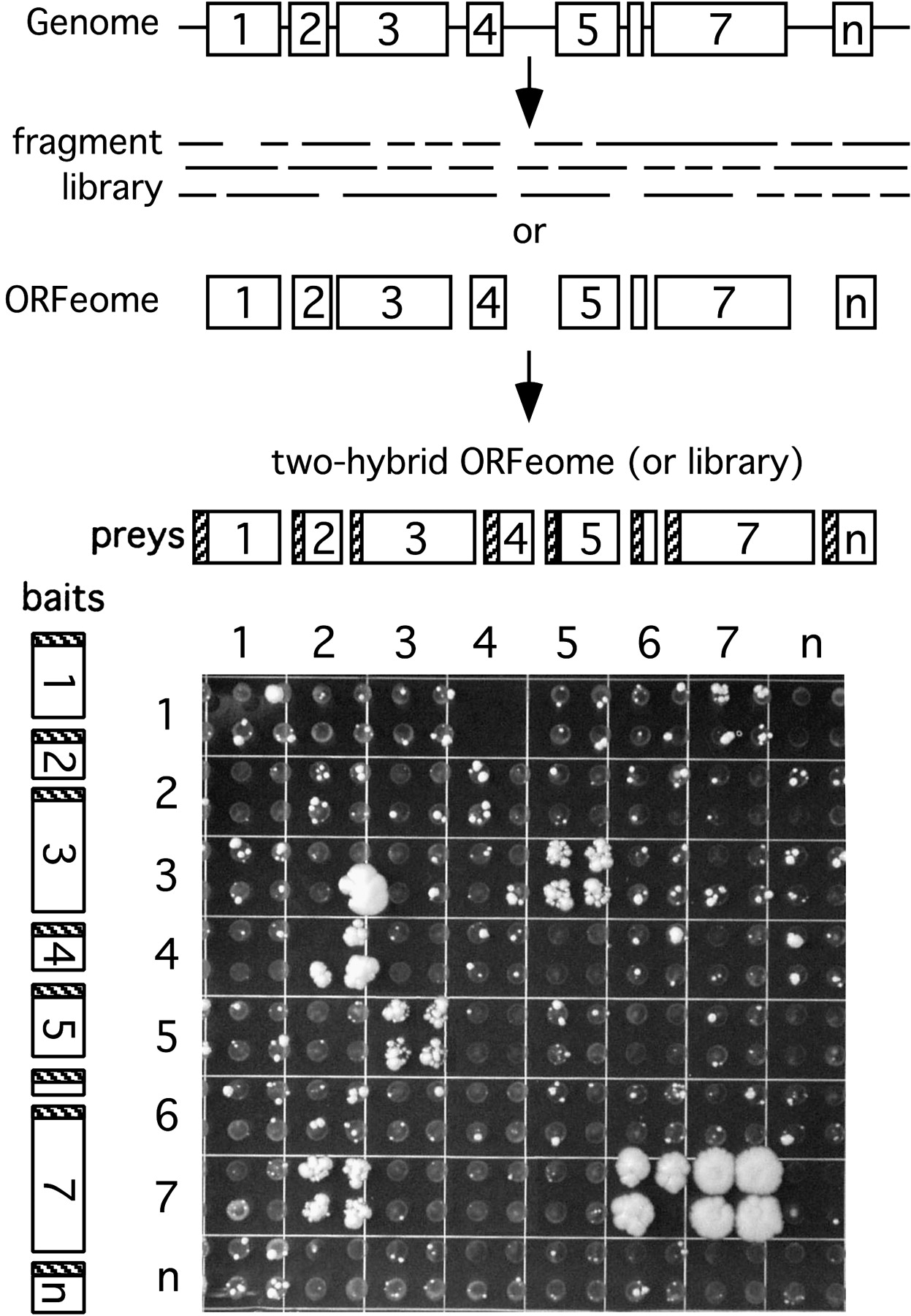 From viral ORFeome to protein interaction map. ORFs can be predicted from sequenced genomes with high confidence and subsequently cloned. Alternatively, libraries of random fragments can be generated. ORFs or fragments can then be cloned into two-hybrid vectors and tested for pairwise interactions in an array format (Uetz 2002). In this experiment, ORFs from KSHV were tested for interactions. Note that each test was done in quadruplicate to ensure reproducibility. Interactions between bait 3 and prey 5 (3-5) is also reproducible in the inverted configuration (bait 5 and prey 3), whereas interactions 4-2 and 7-2, and 7-6 are not. ORF 7 is homodimerizing (7-7). Colony 3-2 is a clear false positive as it is not reproducible in quadruplicate; 4-2 and 7-6 are considered true positives, although only three of four colonies are growing, which may be due to imprecise spotting. Also shown is the noticeable background growth, which can be easily distinguished from the two-hybrid signal in this array format.