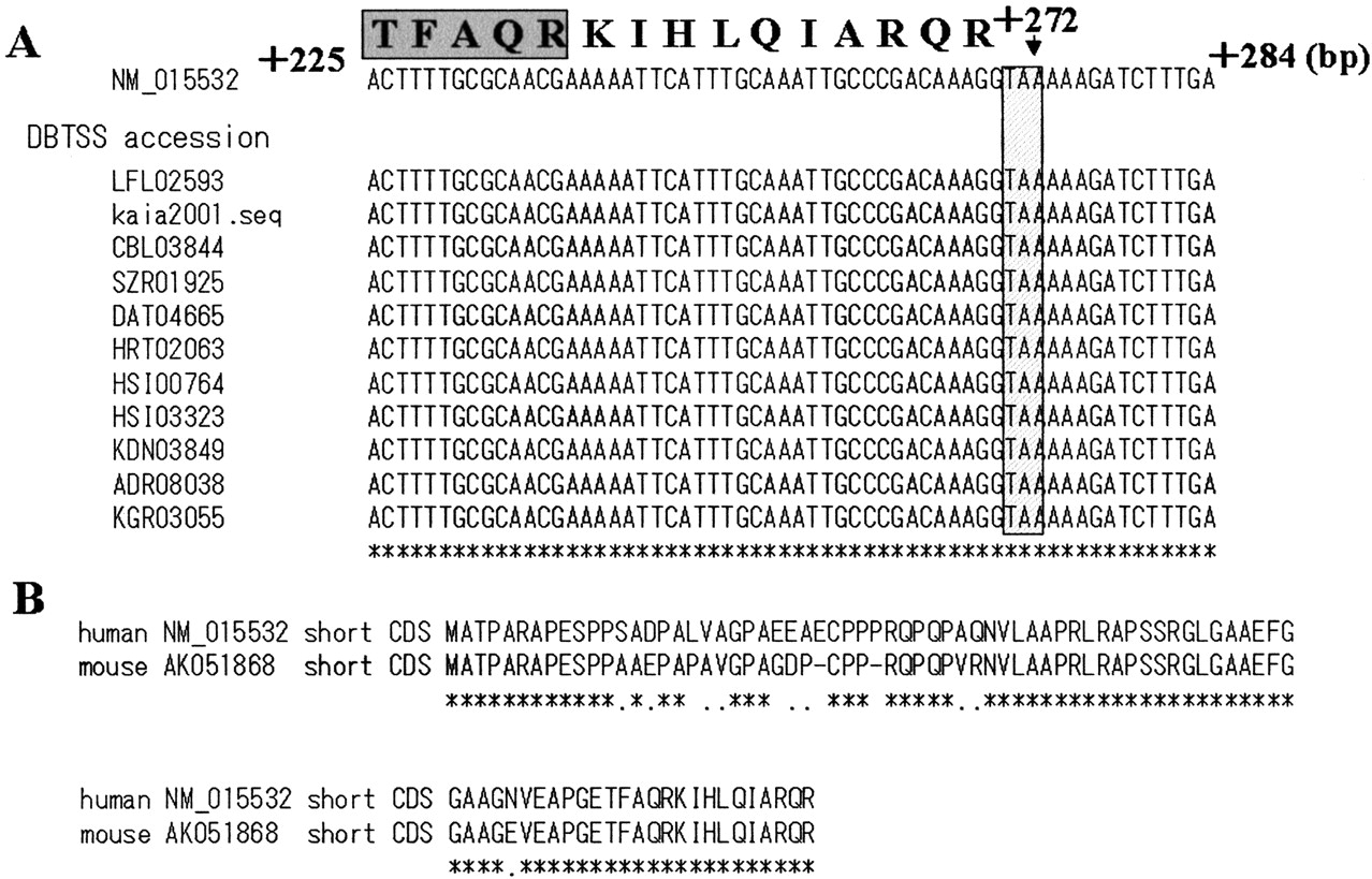 Sequence analysis of the NM_015532 novel short CDS. (A) Multiple alignment of the 5′-end EST data around the termination codon. The dark box shows the C terminus of the secondarily identified peptide. An asterisk (*) indicates a complete sequence match between the RefSeq cDNA (NM_015532) and all the EST data. The shaded box indicates the termination codon of this short CDS. (B) Alignment of the NM_015532 short CDS with its mouse ortholog at the amino acid level. The amino acid sequence of the mouse ortholog was deduced from the sequence (from +13 to +267) of AK051868. An asterisk (*) and a dot (.) indicate identity and similarity in amino acid sequence, respectively. (DBTSS) DataBase of Transcriptional Start Sites (http://dbtss.hgc.jp/; Suzuki et al. 2002).