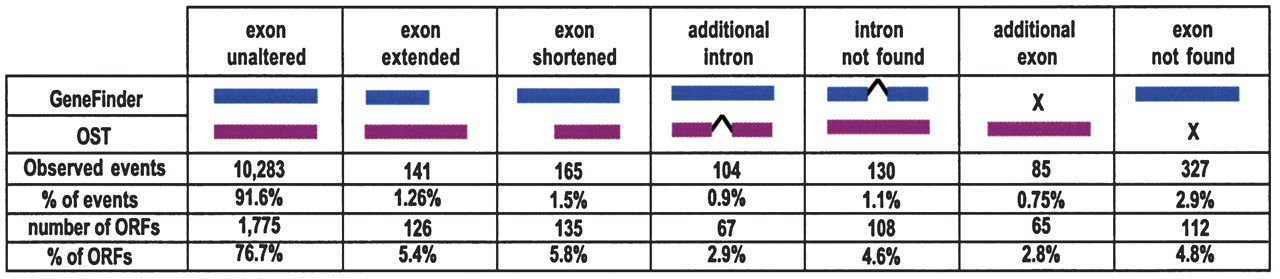 Internal structure differences observed between WS100 predictions and their aligned OSTs. The structure of 540 ORFs has been corrected, each showing one or more differences compared with the corresponding OSTs. OSTs may have more, fewer, longer, or shorter exons than the prediction as well as additional or missing introns.