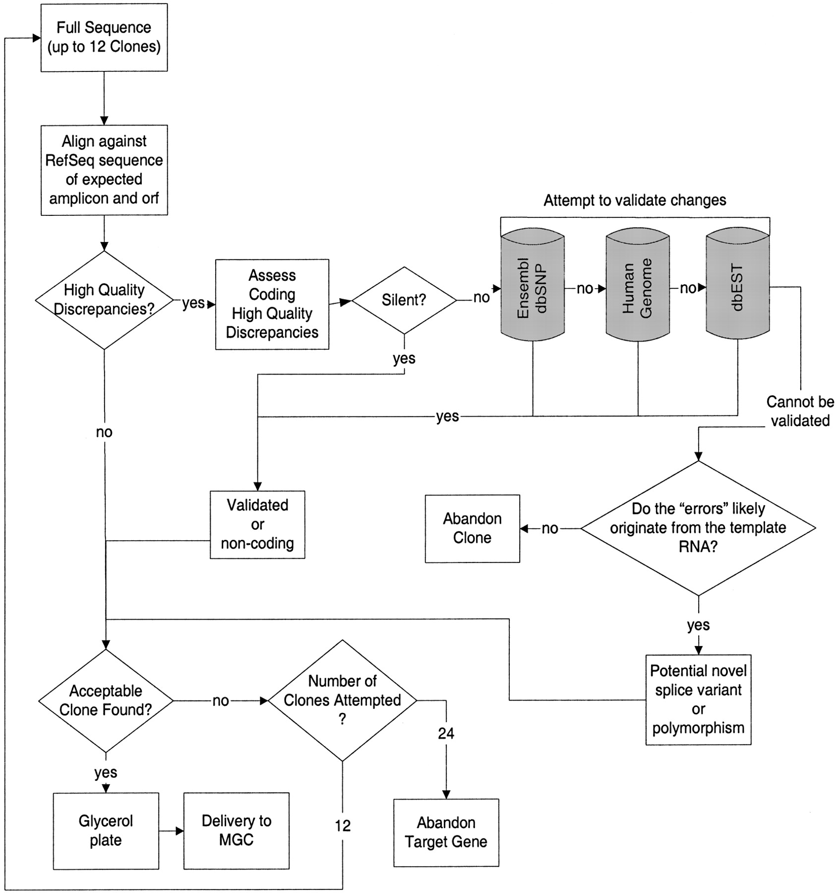 Bioinformatics sequence analysis pipeline. Databases used for validating clone sequence versus RefSeq discrepancies are shown on grey background.