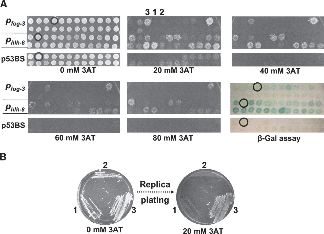 Self-activation by C. elegans promoters. (A) The Y1H Destination plasmids containing the Gateway-cloned promoters Pfog-3 or Phlh-8 were integrated into the genome of YM4271 yeast. Twenty-four double integrant colonies were picked and spotted either onto (1) Sc-His,-Ura media plus increasing amounts of 3AT to determine self-activation of the HIS3 reporter, and onto (2) YEPD plates containing a nitrocellulose filter for a β-Gal assay. Circles indicate colonies that were selected for downstream Y1H experiments. (B) To determine if individual colonies exhibit phenotypic variations after clonal expansion, three Pfog-3 colonies, varying in their extent of self-activation (low = 1, moderate = 2, and high = 3), were picked and restreaked on Sc-His,-Ura media after which they were replica-plated onto selective 20 mM 3AT-containing media.