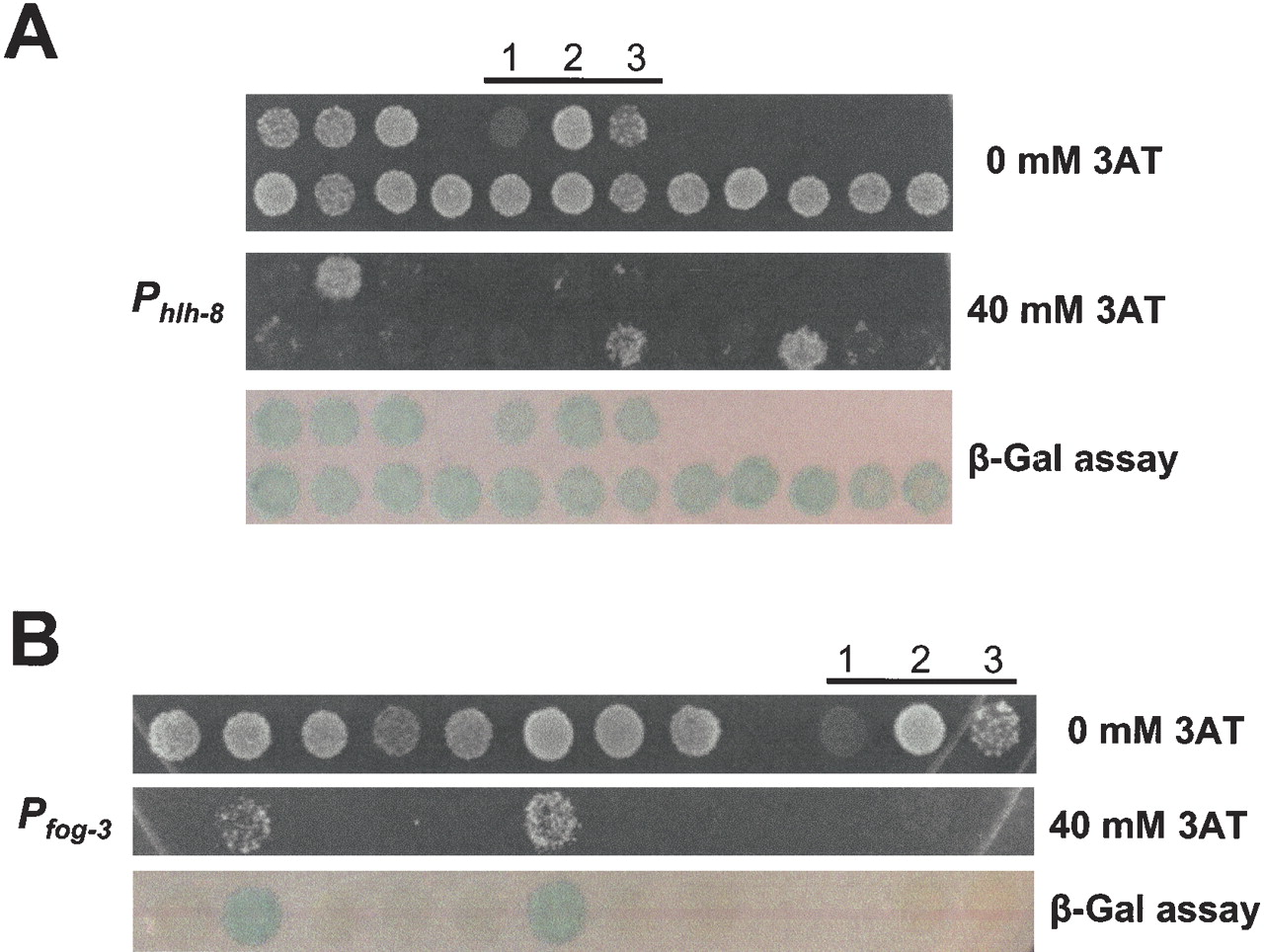Examples of retest of Phlh-8 and Pfog-3 positives. (A) Phlh-8 retest. (B) Pfog-3 retest. Double integrant yeast cells were transformed with an empty vector (containing Gal4 AD) and PCR products containing sequences that encode potential interaction partners as described previously (Walhout and Vidal 2001). Transformants were grown on Sc-His,Ura,-Trp plates with 40 mM 3AT or spotted on YEPD plates containing a nitrocellulose filter for β-Gal assays. Controls: 1 = no DNA, 2 = circular (uncut) empty AD vector, 3 = linear (cut) AD vector.