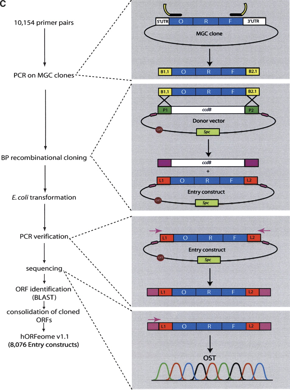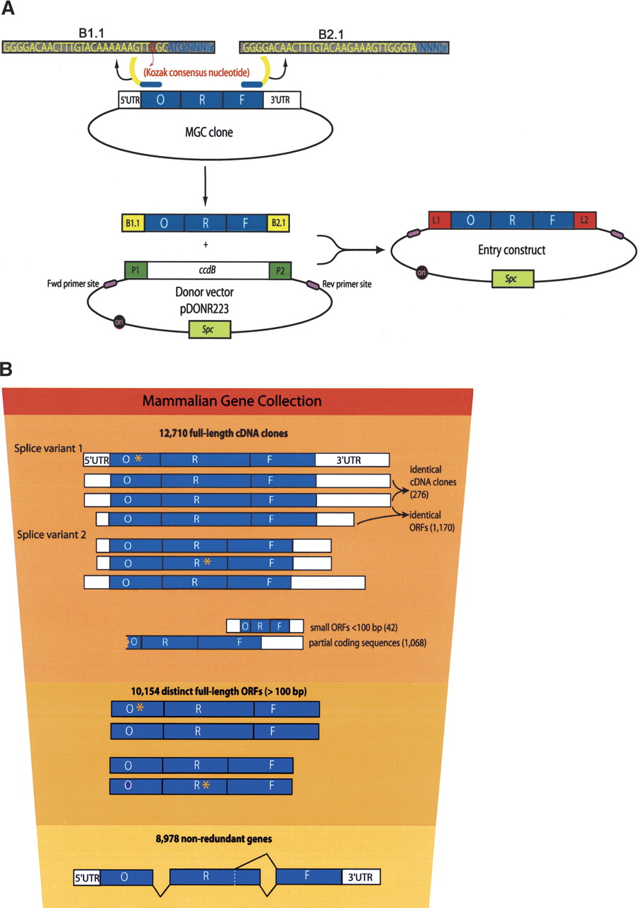 (A) Outline of the Gateway recombination reaction used for generation of hORFeome v1.1. PCR amplification of human ORFs (blue boxes) was performed on isolated MGC cDNA clones. In the depiction of the gene-specific primers, yellow nucleotides represent the altered attB recombination sites (attB1.1 and attB2.1), and blue nucleotides represent the coding sequence in the ORF. PCR-amplified ORFs are cloned by a unidirectional recombinational cloning reaction via their flanking attB1.1 and attB2.1 recombination sites into the pDONR223 Gateway Donor vector. On the Donor vector, the universal Fwd and Rev sequencing primers, the origin of replication (ORI), and the spectinomycin (Spc) selectable marker are indicated. (B) Defining a first version of the human ORFeome starting from the MGC (Mammalian Gene Collection) Resource. The MGC contained 12,710 available full-length human cDNA clones at the time this project was begun. We designed pairs of primers for the PCR amplification of 10,154 distinct full-length ORFs. Asterisks indicate sequence polymorphisms. (C) Scheme for the generation of the hORFeome v1.1 resource. A total of 10,154 pairs of ORF-specific primers were designed to PCR amplify all nonredundant ORFs present in the MGC collection as of March 2004. Amplified ORFs were cloned into the pDONR223 Donor vector by BP recombinational cloning. PCR amplification of cloned inserts for sequence verification was then done using the Fwd and Rev primers that flank the cloning site. Sequencing was performed on the 5′ end with the Fwd primer to generate ORF Sequence Tags (OSTs), and ORFs were then identified by BLAST analysis against the complete MGC set of 10,154 nonredundant clones. Successfully cloned ORFs were consolidated onto new plates, generating the hORFeome v1.1 resource.
