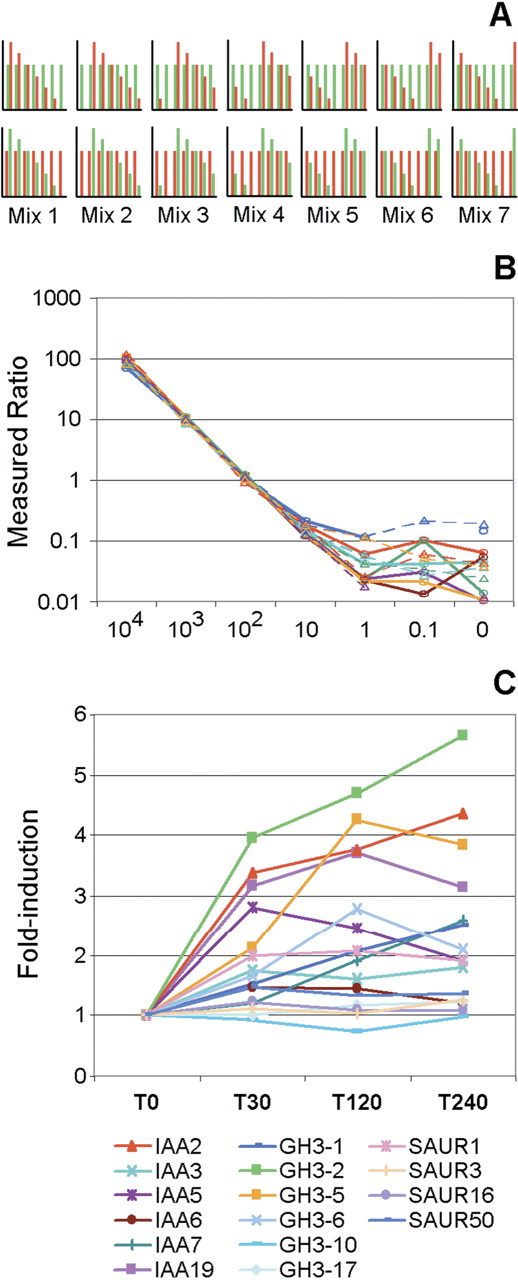 Microarray results. (A) Spiking experiment: Schematic representation of the hybridization series. Each graph shows the spike mRNA content of one microarray hybridization, both in the Cy3 (green) and Cy5 (red) labeled RNA mix. Each bar in a graph represents the concentration of a pair of spike RNAs in an RNA mix (Supplemental Table S3). The numbers indicate the seven scaled RNA mixes containing staggered spike RNAs. The two series of seven graphs represent the reciprocal dye-swap hybridization series in which the reference RNA, containing each of the spike RNA at 100 copies per cell, is labeled either with the Cy3 (top) or Cy5 (bottom) fluorophore. (B) Spiking experiment: Average signal ratios for 13 GSTs corresponding to the spike RNAs across the dilution range expressed as the number of copies per cell. Ratios are represented left to right from the highest to the lowest concentration for all spike RNAs in the seven RNA mixes. As expected, spike RNAs at a 100 copy-per-cell concentration yield a ratio of 1. (C) IAA treatment experiment: Fold induction of known auxin-inducible genes in the Aux/IAA, GH3, and SAUR families.