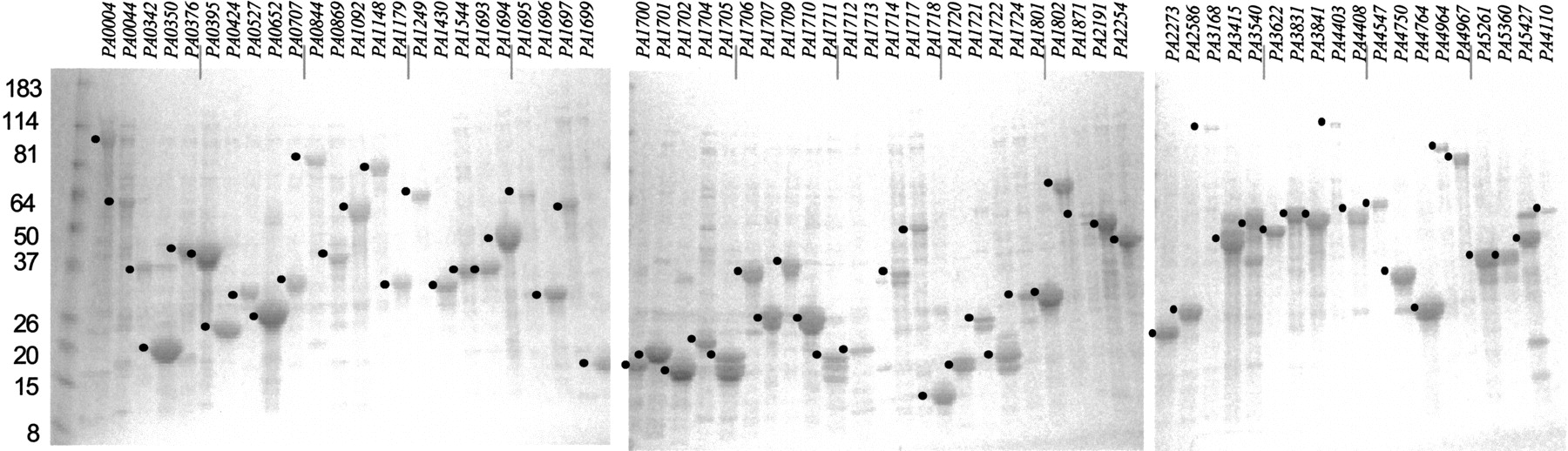Proteins used in the ELISA assays. SDS-PAGE and Coomassie Blue staining of proteins expressed in bacteria as 6xHis-tagged recombinant proteins and subjected to Ni2+NTA purification. Identities and characteristics of the proteins for this set are described in Supplemental Table II.
