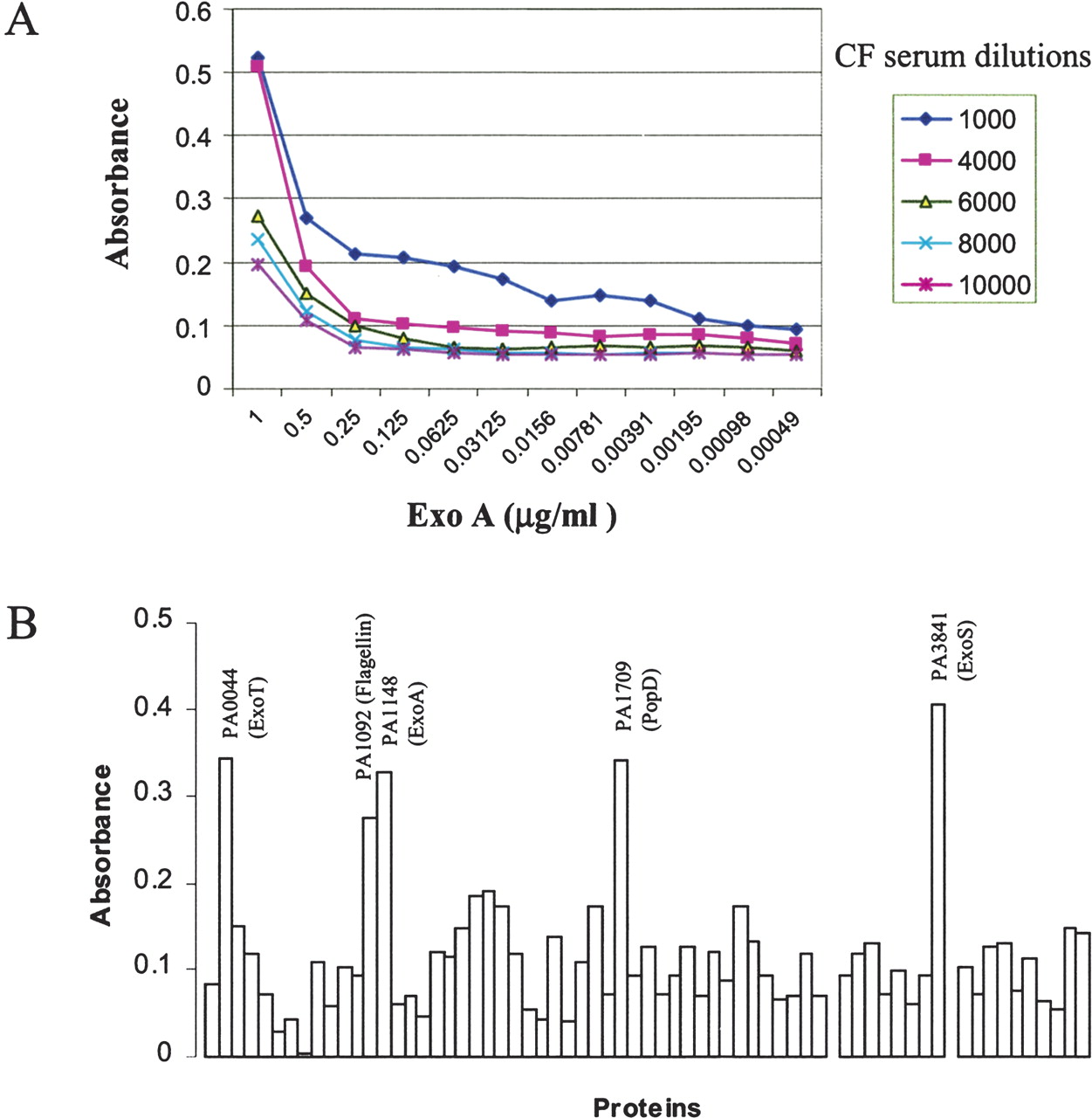 ELISA assay using P. aeruginosa recombinant. Titration curves using serum from a CF patient and various amounts of ExoA (A). Results from the ELISA of 73 P. aeruginosa proteins using serum from a CF patient and normalized by the results obtained with normal serum (B).