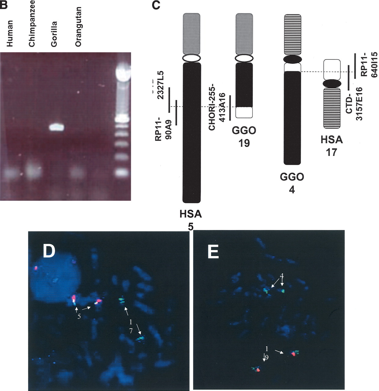 (A) A proposed model of the gorilla evolutionary translocation t(4;19). FISH results showed that the GGO 19 breakpoint maps between BAC clones RP11–640I15 and CTD-3157E16, at the border between LCR17pA/B and LCR17pA/D. The BLAST analysis of this junction in human (indicated with solid arrows) revealed several fission fragments scattered within proximal 17p (border between yellow and green rectangles depicted with dotted arrows), suggesting evolutionary unequal crossing-over constraint on this junction. Such genomic misalignments might have led to chromosome breakage and the origination of the evolutionary gorilla translocation t(4;19). Note the presence of a Charlie3 transposon at the edge of the SMS-REP fragment identified by sequencing the GGO 19 breakpoint and the sequence IMAGE:5265056 likely expressed in the human brain (hippocampus). (B) PCR confirmation analysis of the breakpoint of the gorilla translocation t(4;19). PCR primers spanning the t(4;19) were designed from gorilla BAC genomic clone CHORI-255–413A16 sequence. Genomic DNA from Homo sapiens (HSA), Pan troglodytes (PTR), Gorilla gorilla (GGO), and Pongo pygmaeus (PPY) was subjected to PCR amplification. A 444-bp product was obtained only in gorilla genomic DNA, indicating the translocation is unique to this genus. (C) Schematic diagram of human chromosomes 5 and 17 and gorilla translocation chromosomes 4 “der(HSA17)” and 19 “der(HSA5)”. Vertical bars represent the breakpoint spanning clones. (D,E). FISH analysis of gorilla BACs. (D) Human metaphase spread with human BAC probe RP11–90A9 (red), which hybridizes to chromosome 5 (this clone spans the evolutionary breakpoint but doesn't show a signal on chromosome 17 because the breakpoint is very close to the end of the BAC), and gorilla BAC probe CHORI 255–413A16 (green), which hybridizes to chromosomes 5 and 17, suggesting this clone spans the t(4;19) breakpoint in gorilla. (E) Gorilla metaphase spread with human BAC probe RP11–90A9 (red), which hybridizes to chromosome 19, and gorilla BAC probe CHORI 255–413A16 (green), which hybridizes to chromosomes 4 and 19. (F) The BLAST analysis of the gorilla BAC clone 413A16 spanning the t(4;19) breakpoint revealed a complex rearrangement on the HSA17 portion of this clone. Note the presence of DNA sequences from HSA 17p11.2, 17p13.2, and 17q23.2.