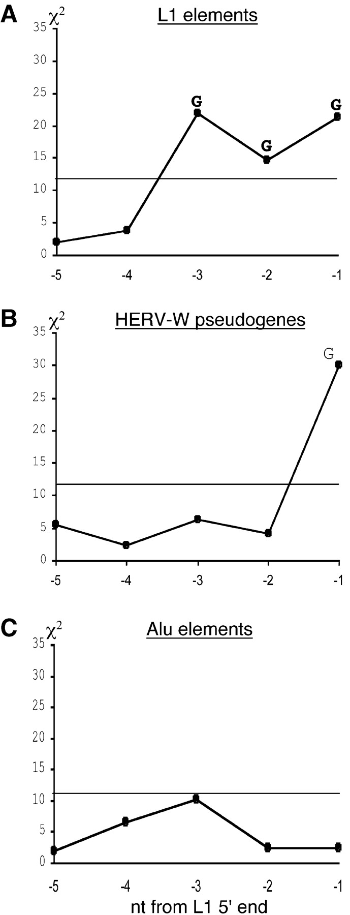 Results of χ2 tests for statistical significance of higher G nucleotide frequencies immediately upstream of (A) the human L1 element start. (B) A significant higher number of G nucleotides in position nucleotide -1 is shown for HERV-W pseudogenes. (C) Human Alu elements do not display such an increase. Thresholds of significance are indicated by horizontal lines.