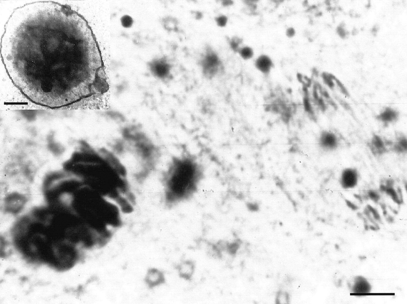 A microphotograph of the C. kolensis chromosomes in the germline cells (left) and at anaphase of the somatic cells (right) during diminution division. An electron microscope photograph of the granules of eDNA (bar = 5 μ) (top upper corner). A poreless, one-layer membrane surrounds the granule (bar = 1 μ).