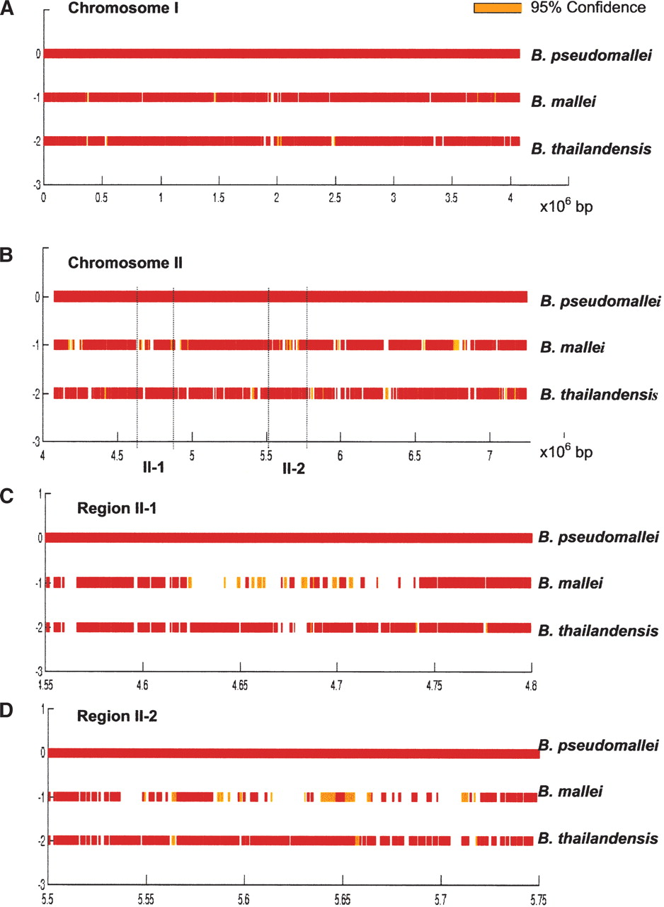 Regions of deletion in B. mallei and B. thailandensis along the B. pseudomallei genome, using t-tests. Chromosome 1 (A) and Chromosome 2 (B) in terms of 106 base pairs. White gaps represent regions deleted at >99% confidence. Orange areas represent deleted regions at the lower level of confidence, 95%. (C,D) Higher-resolution figures for regions II-a and II-b. For z-score versions of A–D, please see Supplemental material.