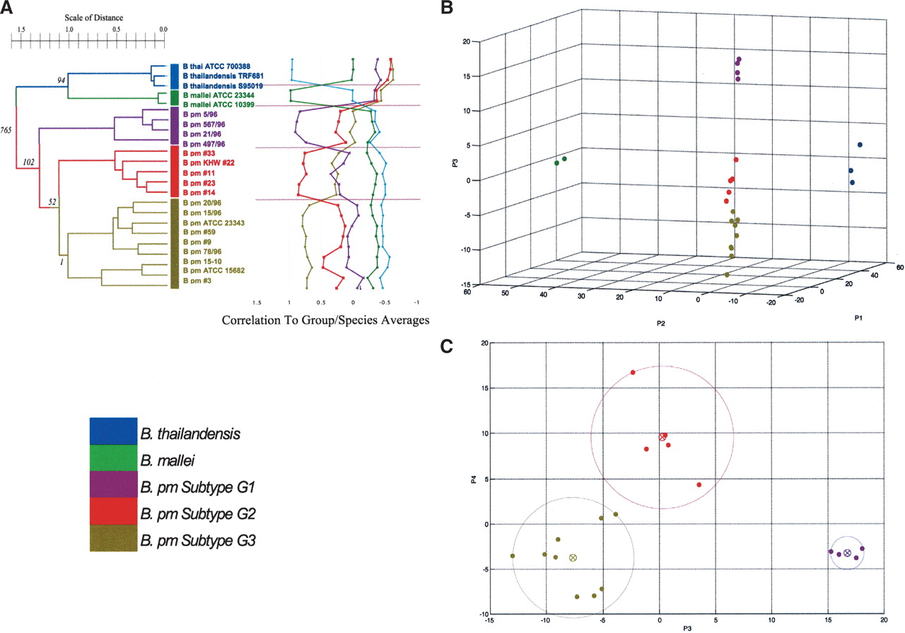 Molecular subtypes of B. pseudomallei.(A) Hierarchical clustering of all Burkholderia strains. B. pseudomallei strains can be grouped into three distinct subtypes (G1, G2, G3), further confirmed by the plot of correlation between each strain and the `average' or `representative' profiles of B. mallei, B. thailandensis, and subtypes G1, G2, and G3 on the right. Numbers at the left of each node represent the number of ORFs that differentiate between the two branches of the node at a confidence level of 99.99% and above. (B) Principal components analysis (PCA) of B. pseudomallei strains based on the top 6000 most highly varying genetic elements. Axes P1, P2, and P3 refer to first, second, and third principal components, respectively. Groupings similar to those in (A) are observed. (C) PCA of B. pseudomallei strains based on P3 and P4. Circled `X's represent centroids of each subtype G1, G2, and G3. A circle is drawn from each centroid to the most deviant member of the corresponding group, showing that none of these circles overlap each other. Distributions similar to those in (A) are observed.
