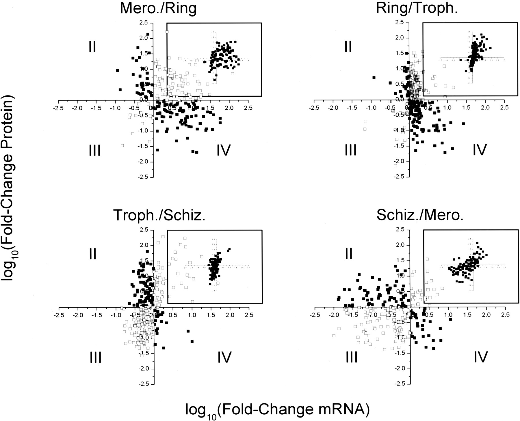 Scatterplots of mRNA and protein fold-changes during developmental transitions. The fold-change in mRNA abundance vs. the fold-change in protein abundance is plotted for each transition in the asexual erythrocytic cycle. Quadrants are designated with roman numerals. Data points falling into quadrants I and III were given open circles, data points falling into quadrants II and IV were given closed circles. Data points that fell into quadrants II and IV were replotted (inset) as the mRNA fold change of the transition indicated vs. the protein fold change of the following transition (i.e., the inset of Mero./Ring is a plot of the fold change in mRNA abundance for the merozoite-to-ring transition vs. the fold change in protein abundance for the ring-to-trophozoite transition).