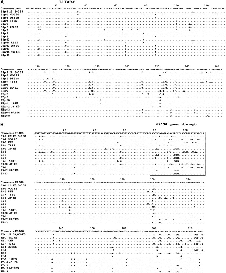 (A) Sequence alignment of different polymorphic BES promoter types found in the different T. brucei telomere clones. The number of the sequence type is indicated on the left. The consensus sequence is shown at the top. Similar nucleotides are indicated with dots. The T2 TAR3′ primer indicated is the downstream end of the TAR target fragment. (B) Sequence alignment of the variable region of ESAG6 in the different T. brucei telomere clones. The number of the ESAG6 type is indicated with numbers on the left. The ESAG6 hypervariable region as identified by Zomerdijk et al. (1990) is indicated with a box.