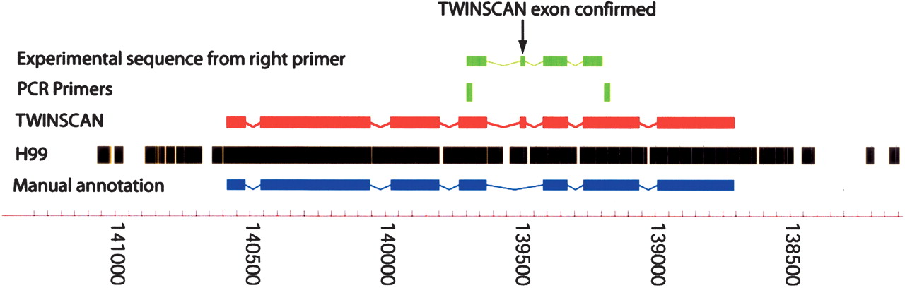 A curated annotation (blue), blocks of ungapped alignment from the genome sequence of Serotype A Strain H99 (black), the TWINSCAN prediction (red), and the PCR primers and experimental sequence aligned back to the genome (green). TWINSCAN's prediction of the missing exon is influenced by both the long ungapped alignment from H99 and the unusually (though not impossibly) long intron in the curated gene structure.