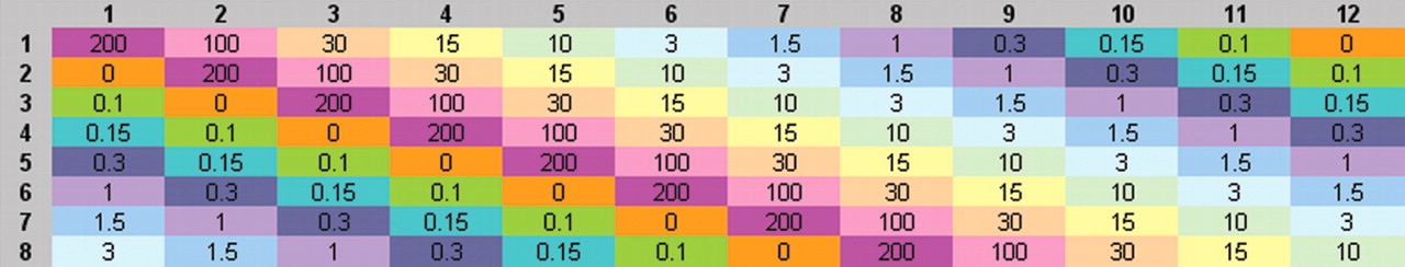 Arrangement of spiked samples for hybridization. Each sample was produced by adding labeled spike controls to labeled complex RNA derived from human HepG2 poly(A+) RNA. The spike controls were added at the pM concentrations indicated in the figure. All nine spiked mRNAs were present at the same concentration within a given sample (e.g., 200 pM in sample a1). Samples were arranged in a staggered fashion to avoid the possibility of row/column positional bias. Hybridization was performed using 1 μg of each sample at a final concentration of 25 ng/μL.