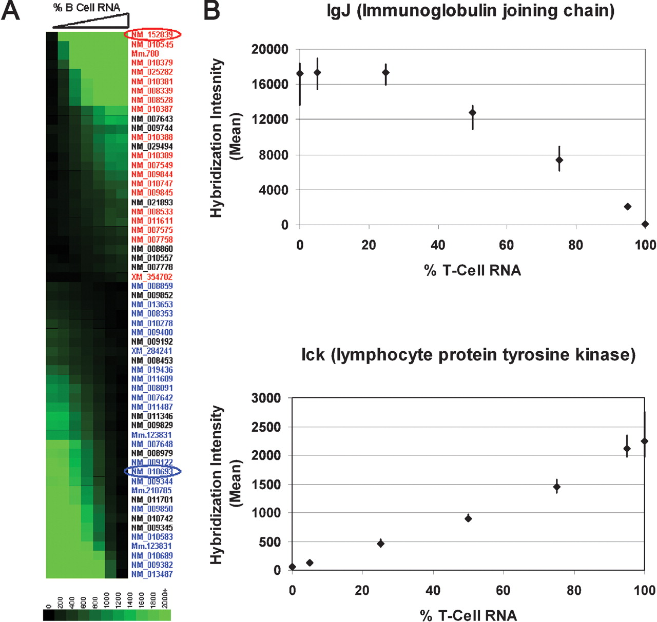 B Cell/T Cell experimental results. Seven RNA samples were prepared containing mixtures of B- and T-cell lymphoma cell-line mRNA. The samples contained 0%, 5%, 25%, 50%, 95%, and 100% B-cell RNA, with the balance in all cases being T-cell RNA. These samples were labeled by our standard protocol and hybridized to six separate arrays each. (A) The hybridization intensities of the 59 most tissue-specific genes are plotted. Each vertical stripe represents a sample and each horizontal row a gene. Boxes represent the mean hybridization intensities measured in six replicate array hybridizations. The intensity scale is shown in the legend at the bottom. Genes are labeled according to their RefSeq or UniGene ID numbers. The colors of these labels indicate prior evidence in the literature of B- or T-cell-specific expression (red refers to B-cell-specific expression; blue refers to T-cell-specific; see Table 2 for references). (B) The dose responses of two representative genes identified in this experiment are plotted. Points represent the mean intensities for each concentration. Error bars represent 90% two-sided confidence intervals calculated from six replicate hybridizations.