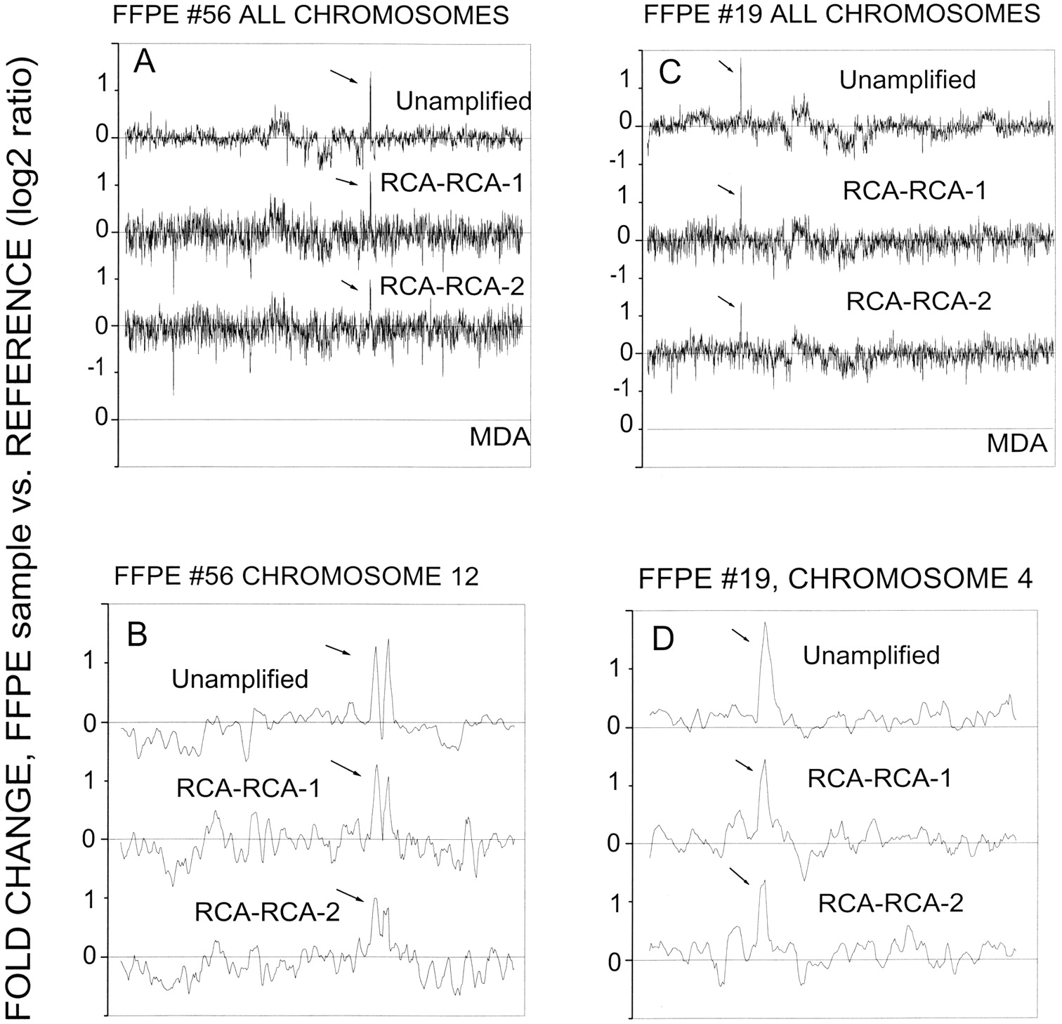 Array-CGH screening for RCA–RCA-amplified genomic DNA from FFPE samples #19 or #56 versus reference DNA. Five-nearest-neighbor smoothing has been applied to these data. Unamplified represents the array-CGH results from sample paraffin #19 or #56 versus reference DNA. RCA–RCA-1 and RCA–RCA-2 are duplicate RCA–RCA amplifications performed in two separate experiments. (A,C) Comparison for all 23 chromosomes. (B,D) Comparison for chromosome 4 (#19) or chromosome 12 (#56). Five nearest neighbor smoothing was used for these data.