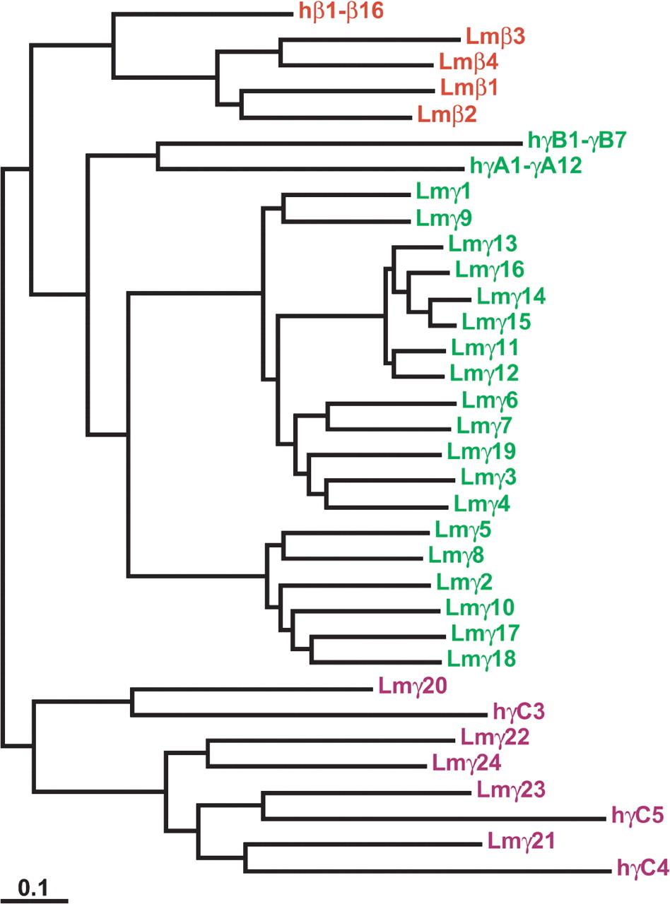 Maximum likelihood phylogeny of coelacanth and human protocadherin β and γ proteins. Colors indicate paralog subgroups as shown in Figure 1. The subtrees of human Pcdhβ1-β16, PcdhγA1-γA12, and PcdhγB1-γB7 are shown collapsed for clarity.