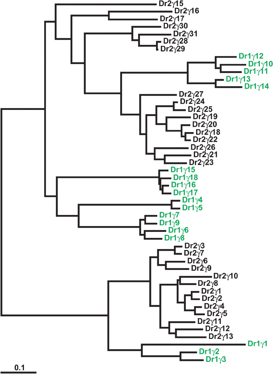 Massive expansion of the Pcdhγ paralog subgroup in zebrafish. DrPcdh1γ paralogs (see Fig. 4) are shown in green. DrPcdh2γ paralogs from BX005294 are shown in black. Pcdh2γ exons are numbered relative to the clone sequence. There are additional zebrafish Pcdh2γ paralogs in draft sequence 5′ of Pcdh2γ1 and 3′ of Pcdh2γ31.