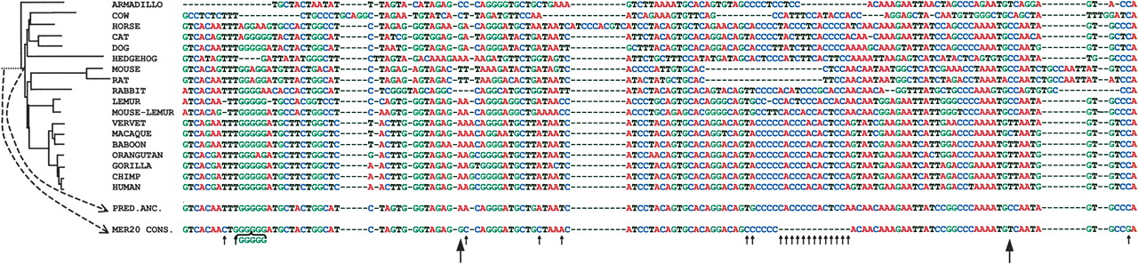 Example of reconstruction of an ancestral Boreoeutherian sequence based on actual orthologous sequences derived from a MER20 retrotransposon. Arrows indicate positions where the reconstructed ancestor differs from the MER20 consensus. Longer arrows indicate the positions where the knowledge of the MER20 consensus sequence would have changed the ancestral base prediction. The position of the human sequence displayed is chr7:115,739,755-115,739,899 (NCBI build 34). The alignment of the flanking nonrepetitive DNA (data not shown) verifies that the sequences from the different species are, in fact,orthologous. The tree and branches are derived directly from Eizirik et al.(2001).