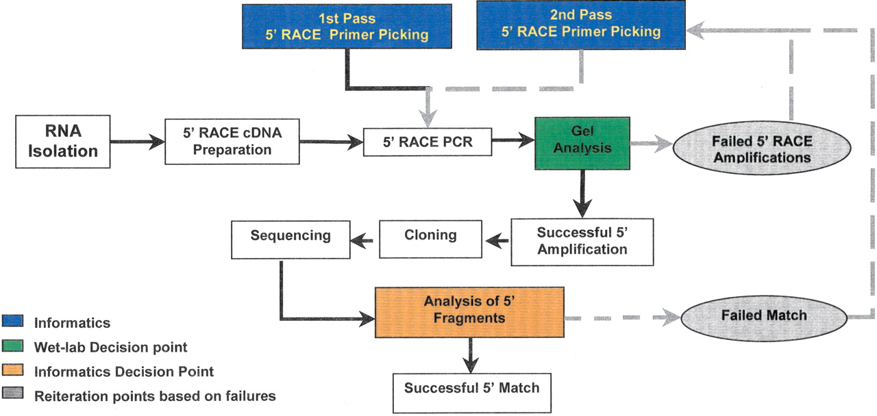 Overview of high-throughput workflow. The initiation of this workflow begins with the selection of genes for experimental verification. The gene models associated with these genes are used to select 5′ RACE–PCR primers (1st pass) (for more details, see Supplemental information). The primers are used to amplify RACE templates that have been generated in parallel. Failed amplifications are identified via agarose gel analysis, and new primers are picked for those genes (2nd pass). The products of the successful amplification are ligated into a plasmid vector. Eight clones from every amplification are sequenced and analyzed by comparison to the existing gene model. Amplified fragments that do not match their associated gene model are evaluated, and new primers are picked for the associated gene model (2nd pass). Successful matches are further evaluated in terms of whether they modify the current gene model, and the sequence is submitted to GenBank.