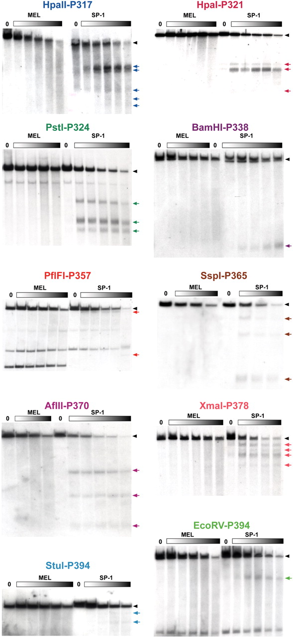 DNaseI HS mapping of the Sprr locus. Keratinocyte-specific patterns of DNaseI HSs at the conserved regions of the Sprr locus. Nuclei from SP-1 cells and MEL cells were treated with increasing amounts of DNaseI (closed rectangles), and isolated DNAs were digested with restriction enzymes and subjected to Southern blotting with a probe as indicated. The HSs bands are indicated on the right by colored arrows, and their localization in the mouse sequence is shown in Figure 1C. The exact locations of probes and restriction enzyme sites are given in Supplemental Table I.