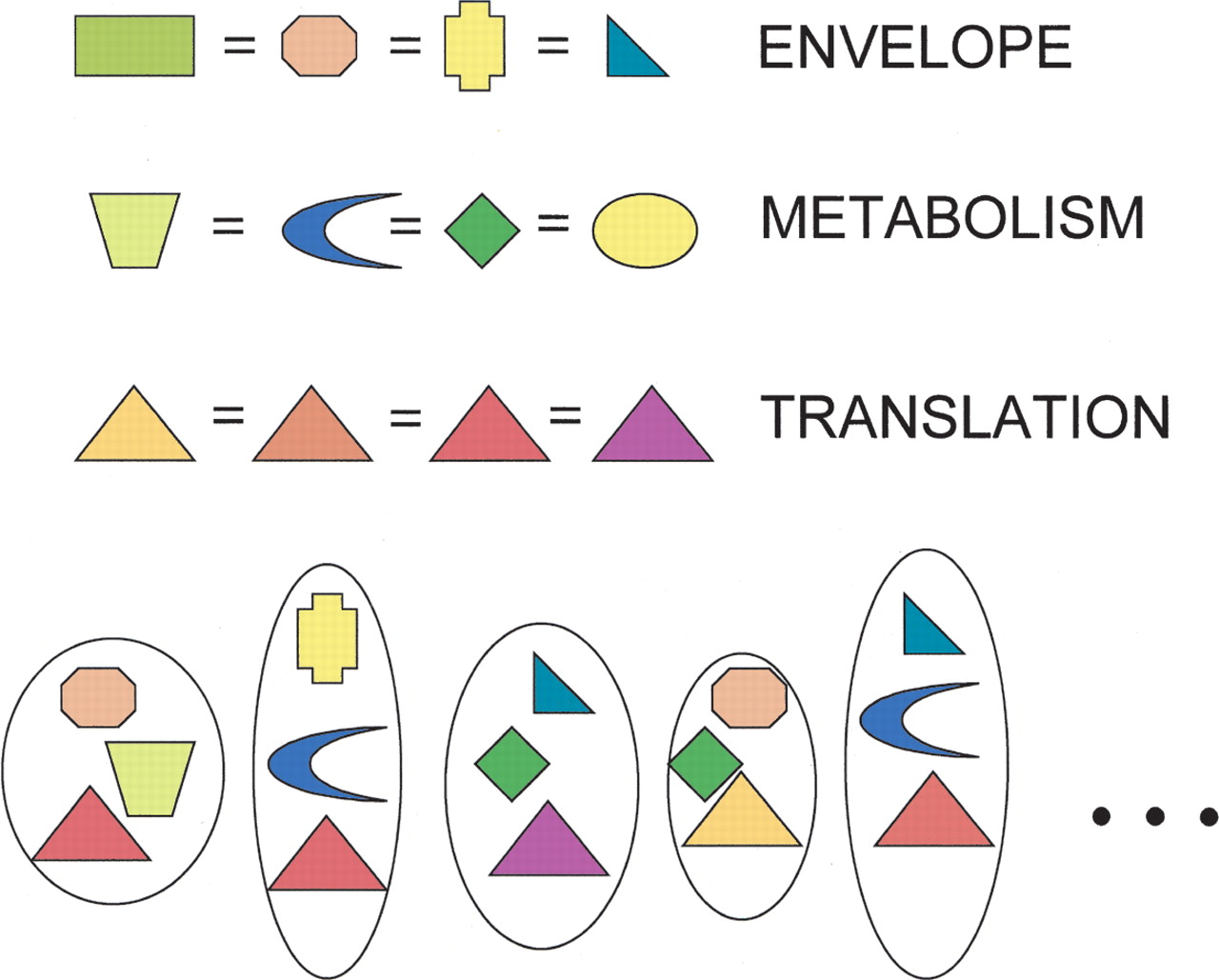 A mix-and-match model for prokaryotic genome evolution. Every cell needs genes for multiple functions, and new genomic lineages arise in evolution through mixing and matching of genes performing these different functions, by processes of replacement, including nonorthologous displacement (Koonin et al. 1996). The simplest hypothesis would be that all functions are equally subject to such exchange processes. For many functions, available genes include nonhomologs and even null entries (gene and function loss), indicated here by different shapes. Thus, for these functions, no genes or even gene families will likely appear to be shared among all genomes. For some informational functions especially (such as translation), displacement most often involves genes that, although evolutionarily distinct (as indicated by colors), are homologous (as shown by shape). Such genes will appear among those of the ubiquitous core.