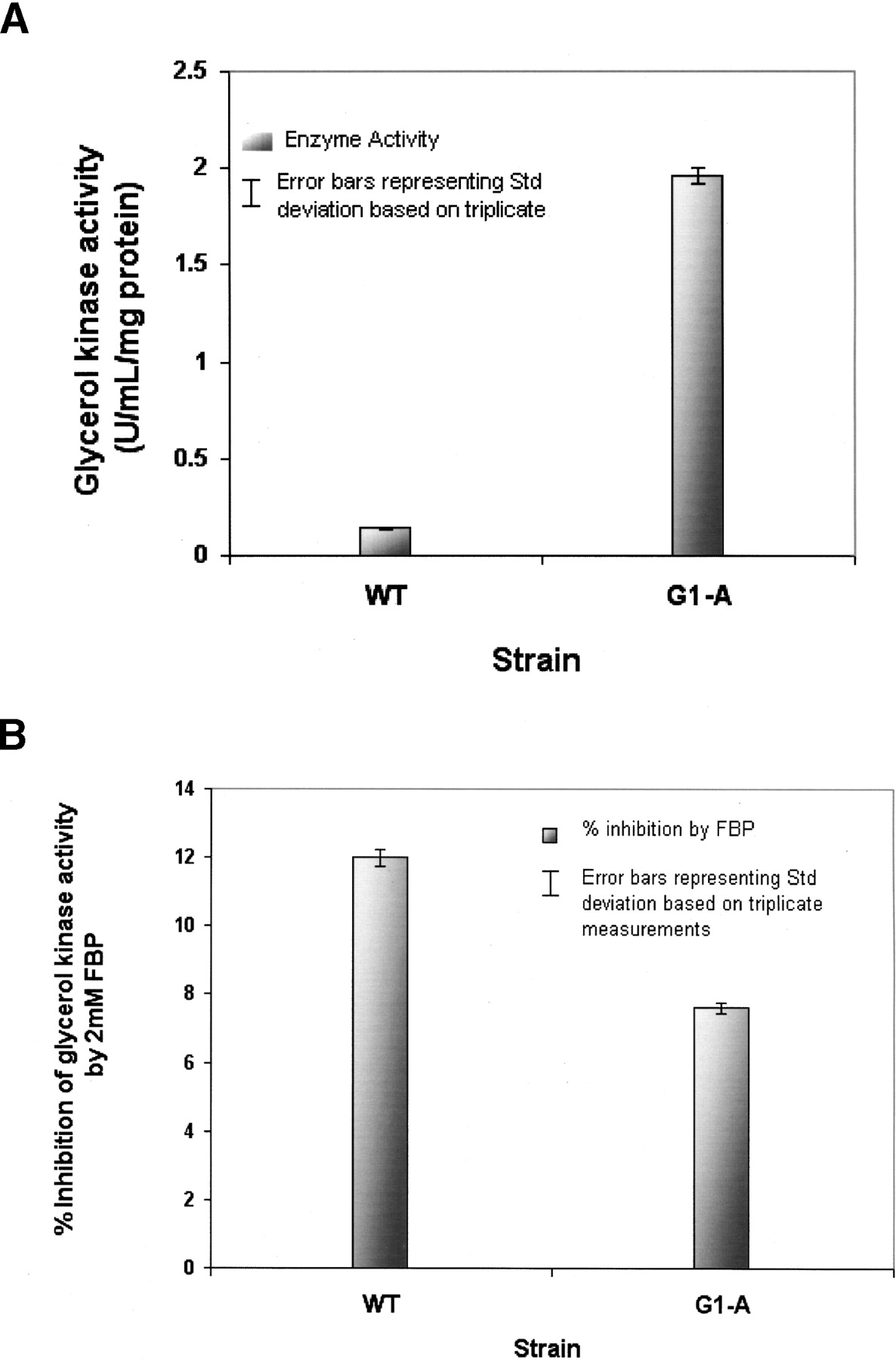 Enzyme kinetics of the glycerol kinase variant (G692A, Gly232Asp) of E. coli G1-A in comparison to the wild-type enzyme (wt). Enzyme activities were determined as a decrease in absorbance at 340 nm monitoring ADP release by coupling pyruvate kinase and lactate dehydrogenase activity as detailed in Methods. (A) A 12-fold increase in enzyme activity in the recombinant mutant clone as opposed to the wild type. (B) Enzyme inhibition by an allosteric inhibitor Fructose-1,6-bisphosphate (FBP) was determined by addition of FBP to a final concentration of 2 mM. Inhibitory effects decreased by ∼33% in the enzyme variant when compared to the wild-type enzyme.