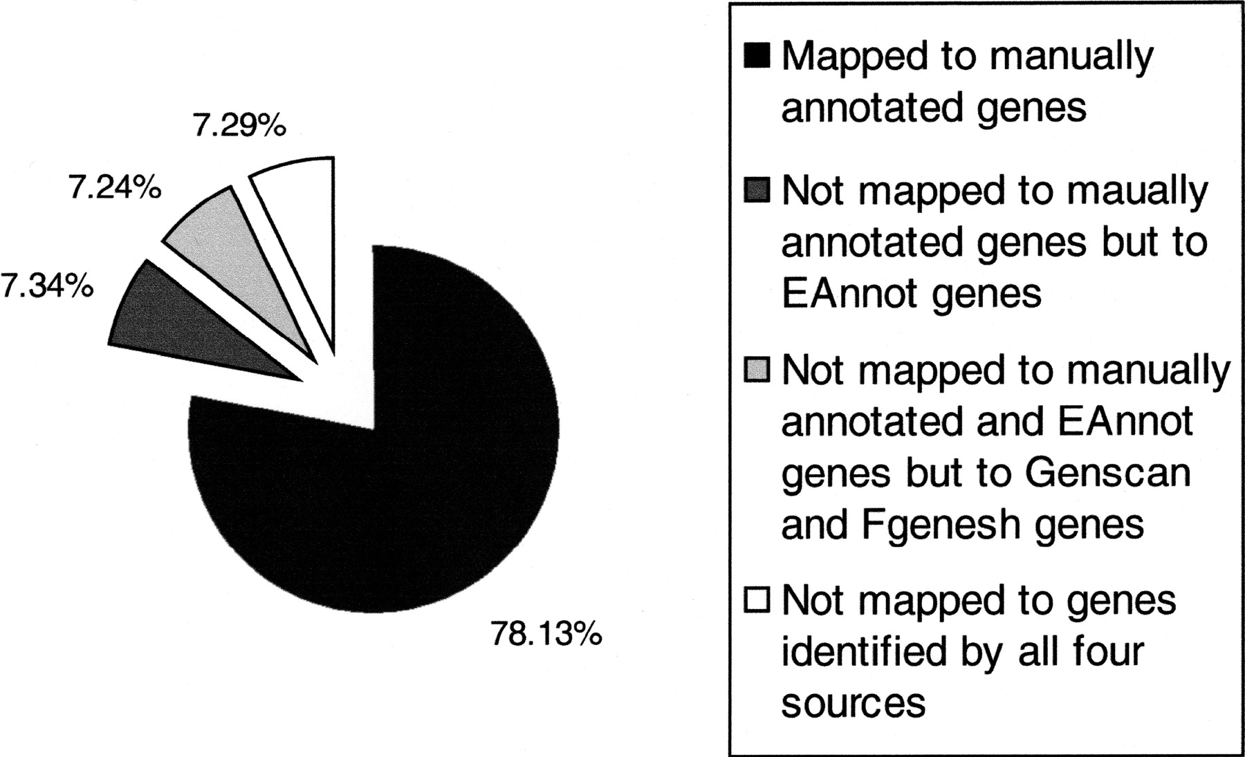 Poly(A) signals and sites identified by EAnnot serve as anchors for genes. A total of 1704 (78.1%) poly(A) sites identified by EAnnot are mapped within 5 kb from the 3′ end of manually annotated chromosome 6 genes. Among the ones not mapped to manually annotated genes, 7.3% are mapped to EAnnot genes. Among those mapped to neither manually annotated nor EAnnot genes, 7.2% are mapped to Fgenesh or Genscan genes; 7.3% are not mapped to any genes identified by the above four gene prediction methods.