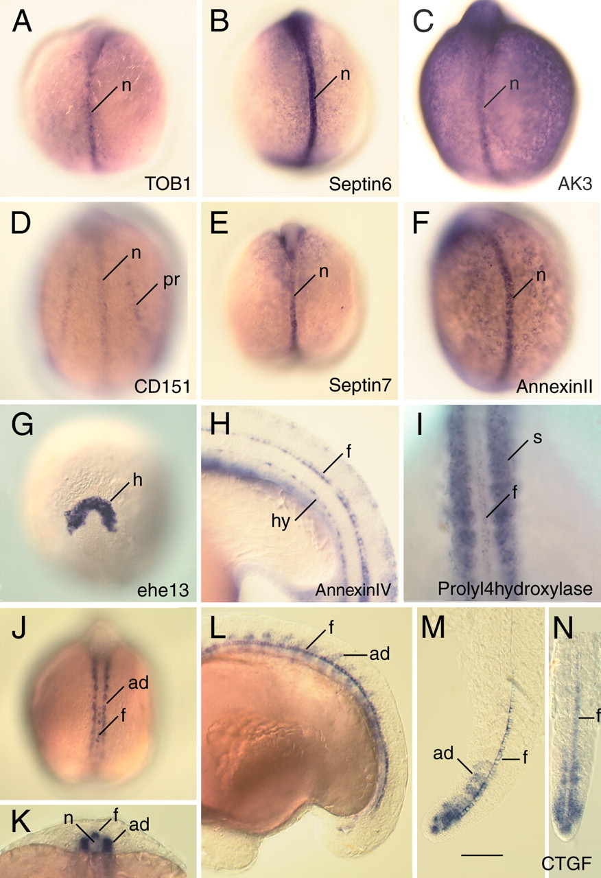 Representative RNA expression patterns of identified midline genes. (A) transducer of erbB-2 1 (Tob1). (B) septin6. (C) adenylate kinase 3 α like 1 (AK3). (D) CD151/tetraspanin (CD151). (E) septin7. (F) annexin II. (G) Homolog of the medaka hatching enzyme ehe 13. (H) annexin IV. (I) prolyl-4- hydroxylase. (J-N) connective tissue growth factor (ctgf). (A-G,I,J) Eight-somite-stage embryos; (H,L,N) 16-18-somite-stage embryos. Orientation of embryos is anterior up, dorsal view(A-G,I,J). Scale bar: 50 μm (A-G,J,L); 25 μm (H,K,M,N). (ad) Adaxial cells; (f) floor plate; (h) hatching gland; (hy) hypochord; (n) notochord; (pr) pronephros; (s) somites.