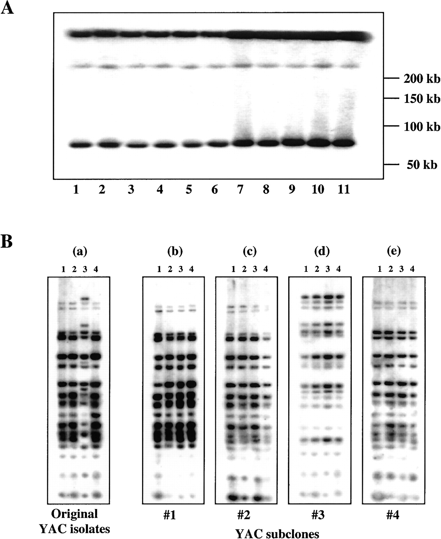 Integrity of TAR YAC isolates in yeast. (A) YAC DNA was isolated from the original GAP6-#1 clone (lane 1), five of its subclones (lanes 2-6) and five transformants with YAC/BACs (lane 7-11), digested by NotI, separated by CHEF, and then hybridized with an Alu probe. Clones have the same size, indicating that these clones do not have detectable deletions in yeast. (B) Alu profiles of the original TAR YAC clones containing the GAP6 sequence and their subclones. Total yeast DNA was isolated from four independent gap-positive transformants and from four subclones of each independent TAR isolate and digested to completion with TaqI. Fragments were separated by gel electrophoresis, transferred to a nylon membrane, and hybridized with an Alu probe. (Alu profile of isolates differs slightly due to differences in the size of TAR isolates.) (a) Four independent TAR isolates of GAP6-#1, -#2, -#3 and -#4. (b-e) correspond to four subclones of each independent isolate, respectively.