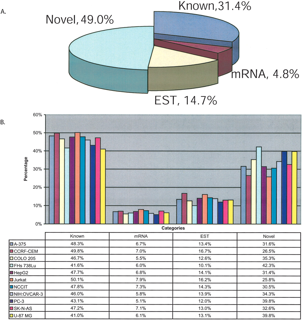 Characterization of all transfrags based on annotations. Transfrags from all 11 cell lines were classified based on their base pair overlap with annotations. The annotations are (1) Known, overlapping with known annotations (compiled by UCSC Genome Browser based on protein-coding genes from SWISS-PROT, TrEMBL, and TrEMBL-NEW); (2) mRNA, overlapping with mRNAs and not known; (3) ESTs, overlapping with ESTs and not known or mRNAs; and (4) Novel, not overlapping known exons, mRNAs, or ESTs. (A) Pie chart representing all transfrags from “1 of 11” map. (B) Bar graph shows the percentage of all transfrags from each of the 11 cell lines by annotation class. An overlap of even a single base pair is considered as an intersect between the transfrag and annotation.